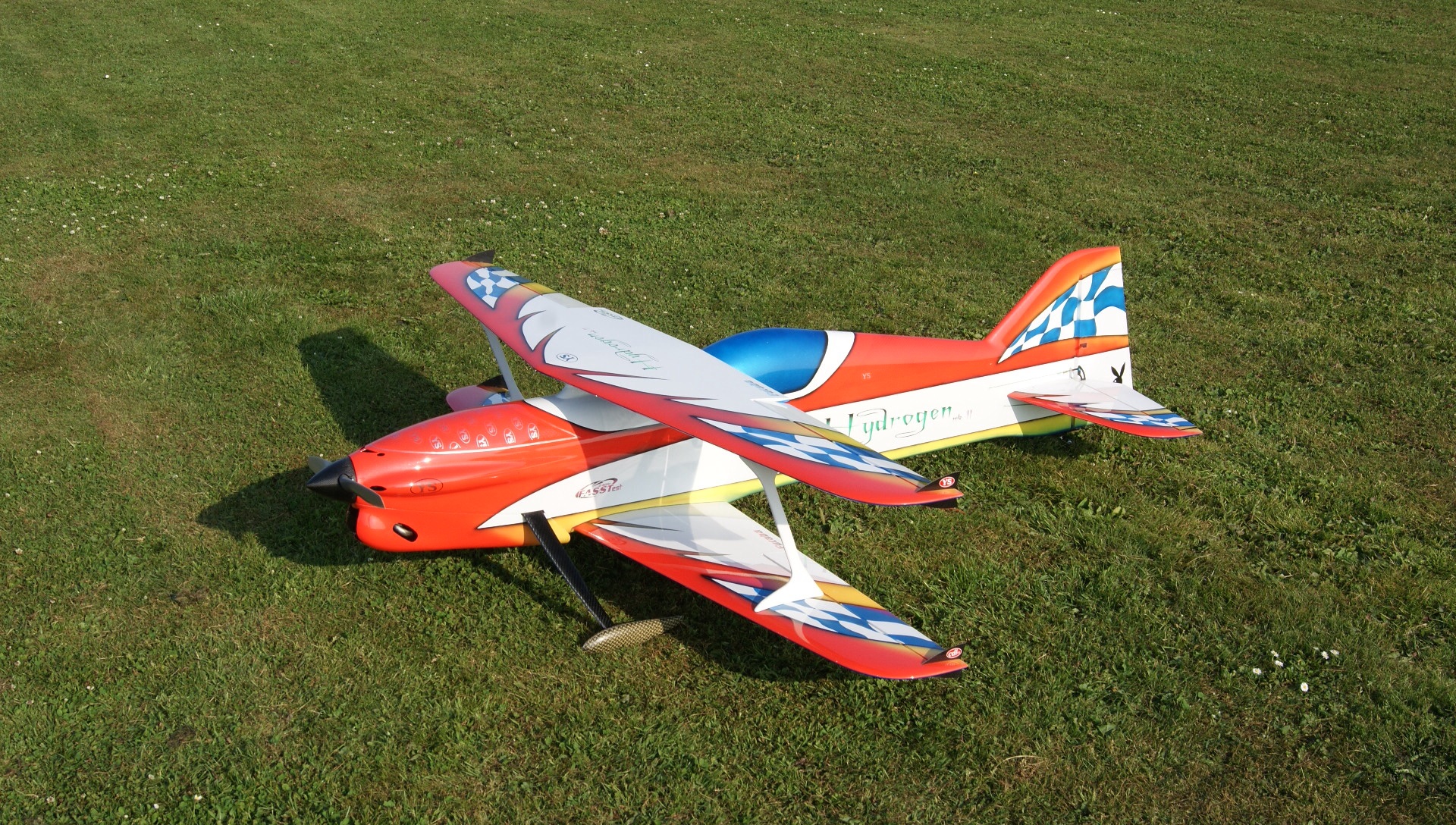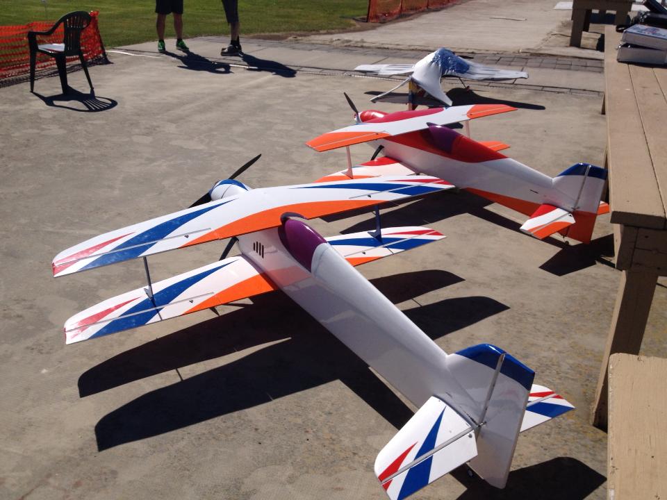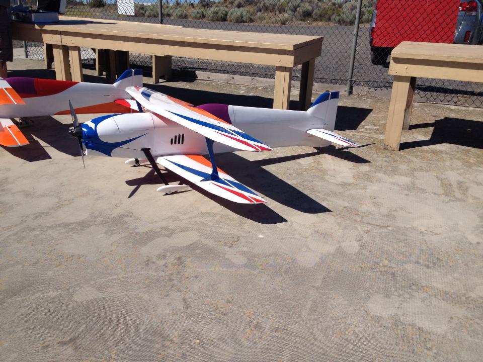 Here is Team Safarik's Creation, the Caelus Bipe. My dad Pavel designed and built them. Construction is a mix of balsa/foam for the wings, stab, and parts of the fuselage, and molded fiberglass parts for the cockpit, canopy and bottom tail. The Prototype is the red and orange one, which started life at 5.5kg but got down to 4940g with a hacker c50 xl11 and 9s 25-50c 5000mah batteries. the white/blue/orange model was much lighter, coming in at 4800g with a helical neu motor and the same 9s batteries. I got to fly the prototype at the Nats as my reciever battery failed mid-flight in the blue/orange incarnation. The airplane flies beautifully, with just a touch too much fuselage side area. The Plan for this winter is a composite fuse, and foam/built-up/composite wings depending on time.