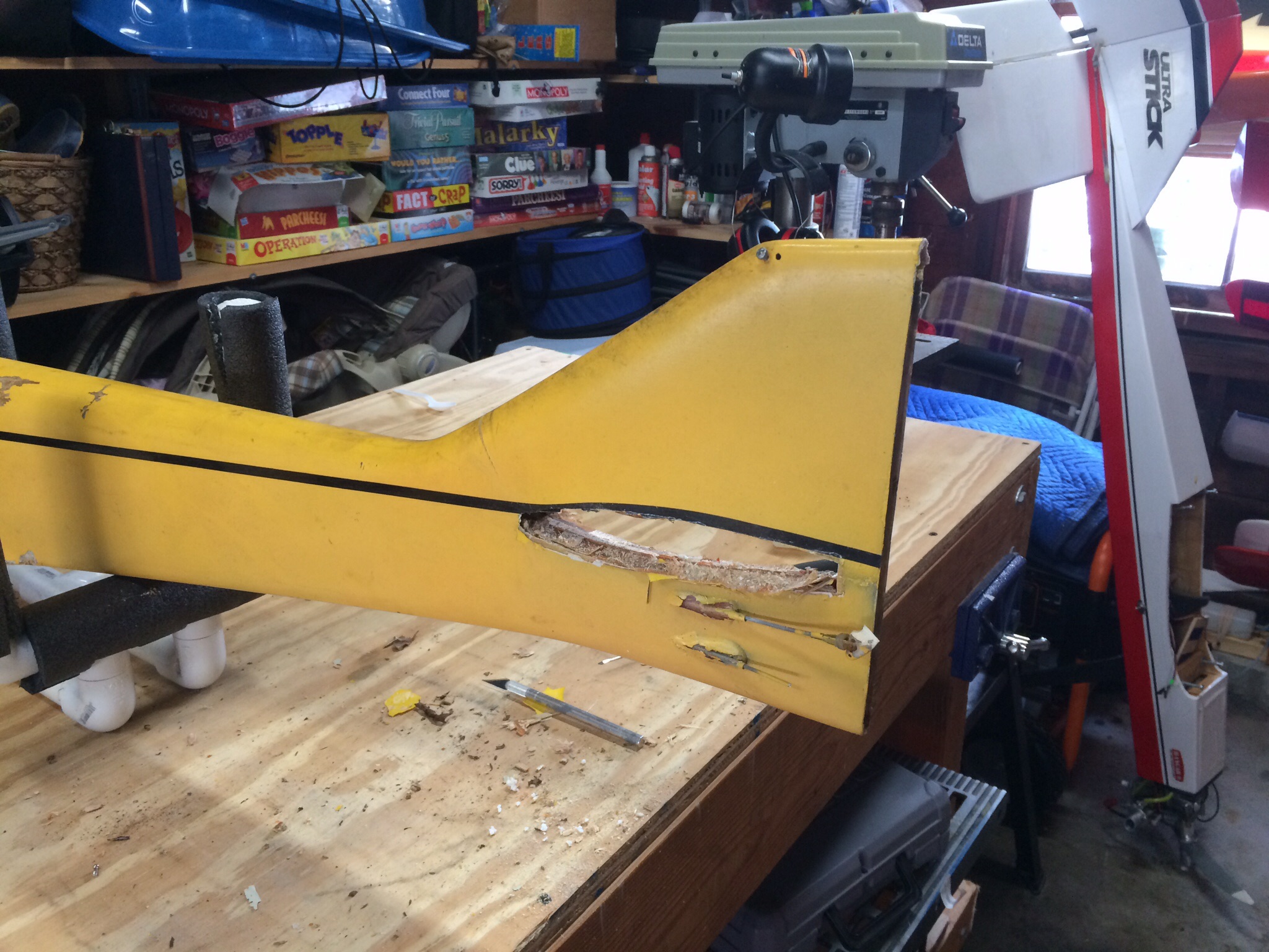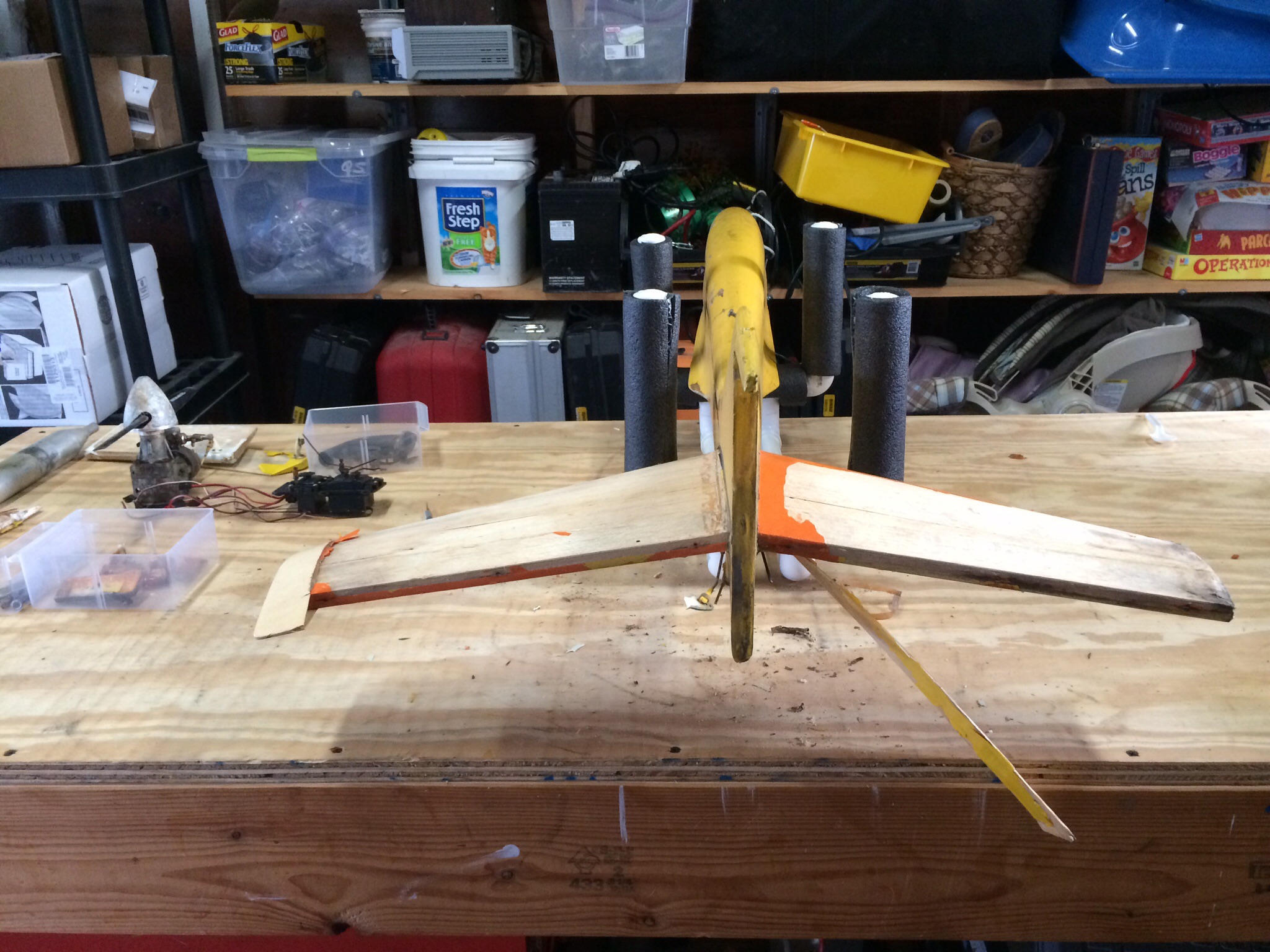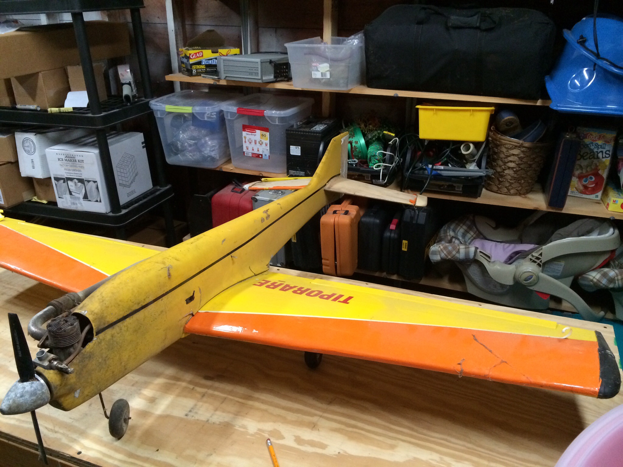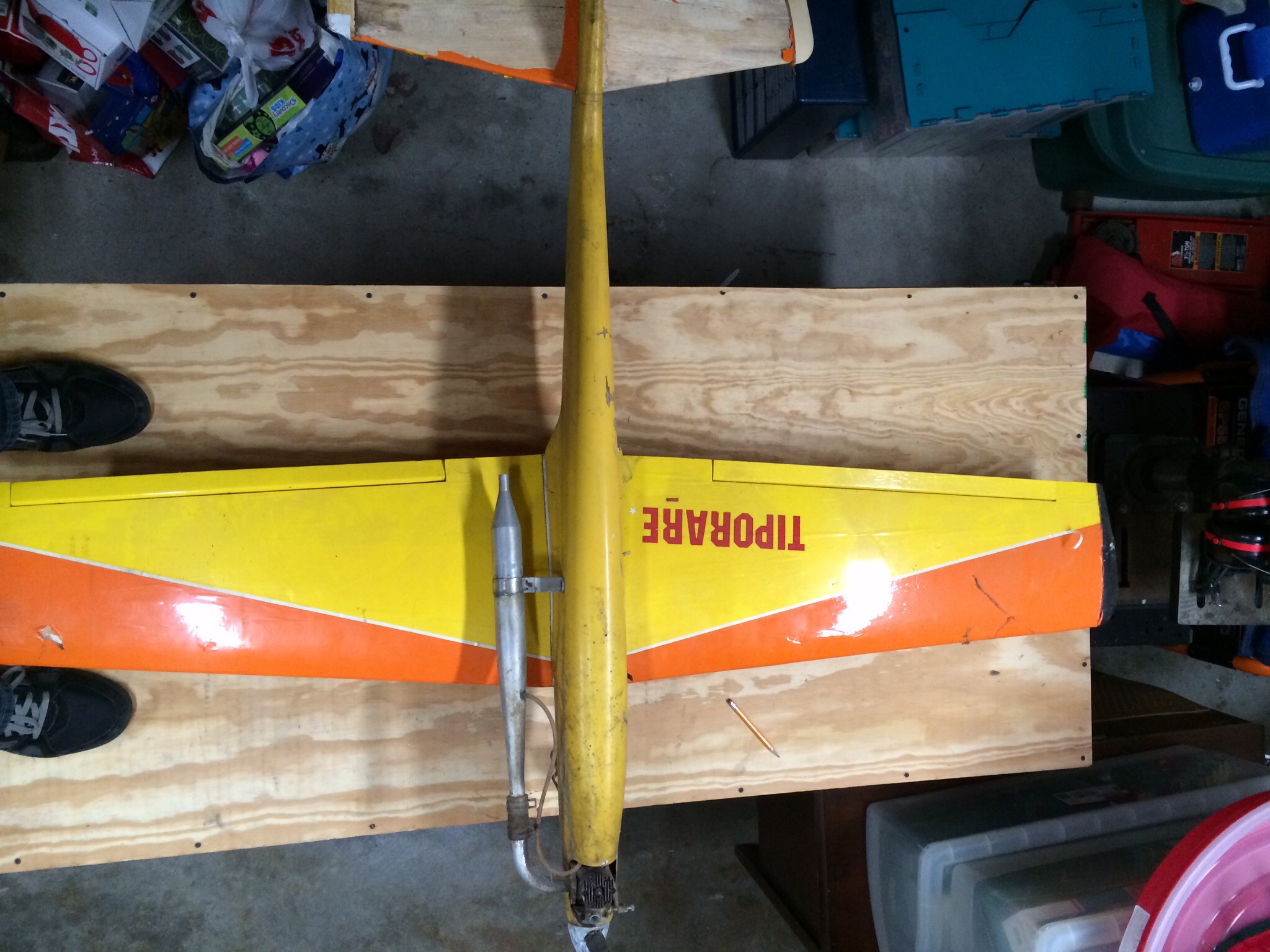 So my father starting flying around 1973 and always loved flying pattern. In 1991 he purchased a Greatplanes Tiporare from Rays hobbie in Warwick, RI. In 1993 my parents split up and he sold off all his gear to Nancy's Hobby in Warren, RI. He passed in 2004. The hobby shop owner passed in 2010.....So I received a call from the late owners wife last month that while cleaning out the basement of what used to be the hobbie shop, she had stumbled upon my fathers old plane and asked if I wanted it. So I jumped at the chance and grabbed it from her. Twenty years of sitting in a basement has taken its toll. So I'm planning a full restoration to get it back to flying condition. It's going to need some fiberglassing and a new stab but it's very doable.