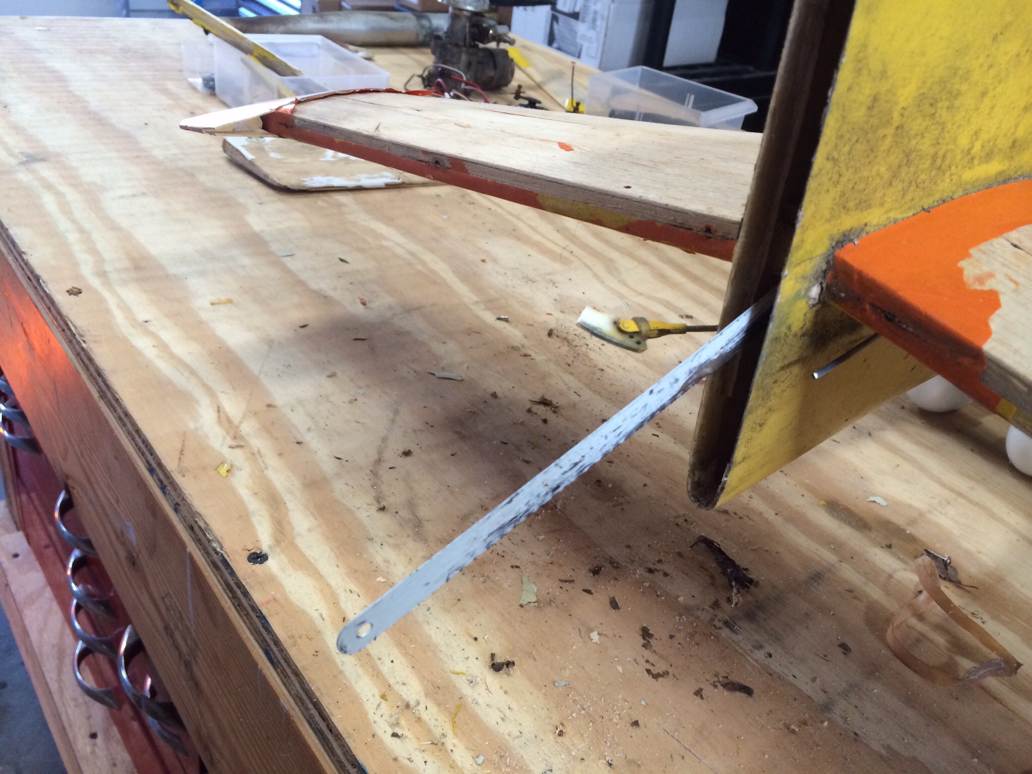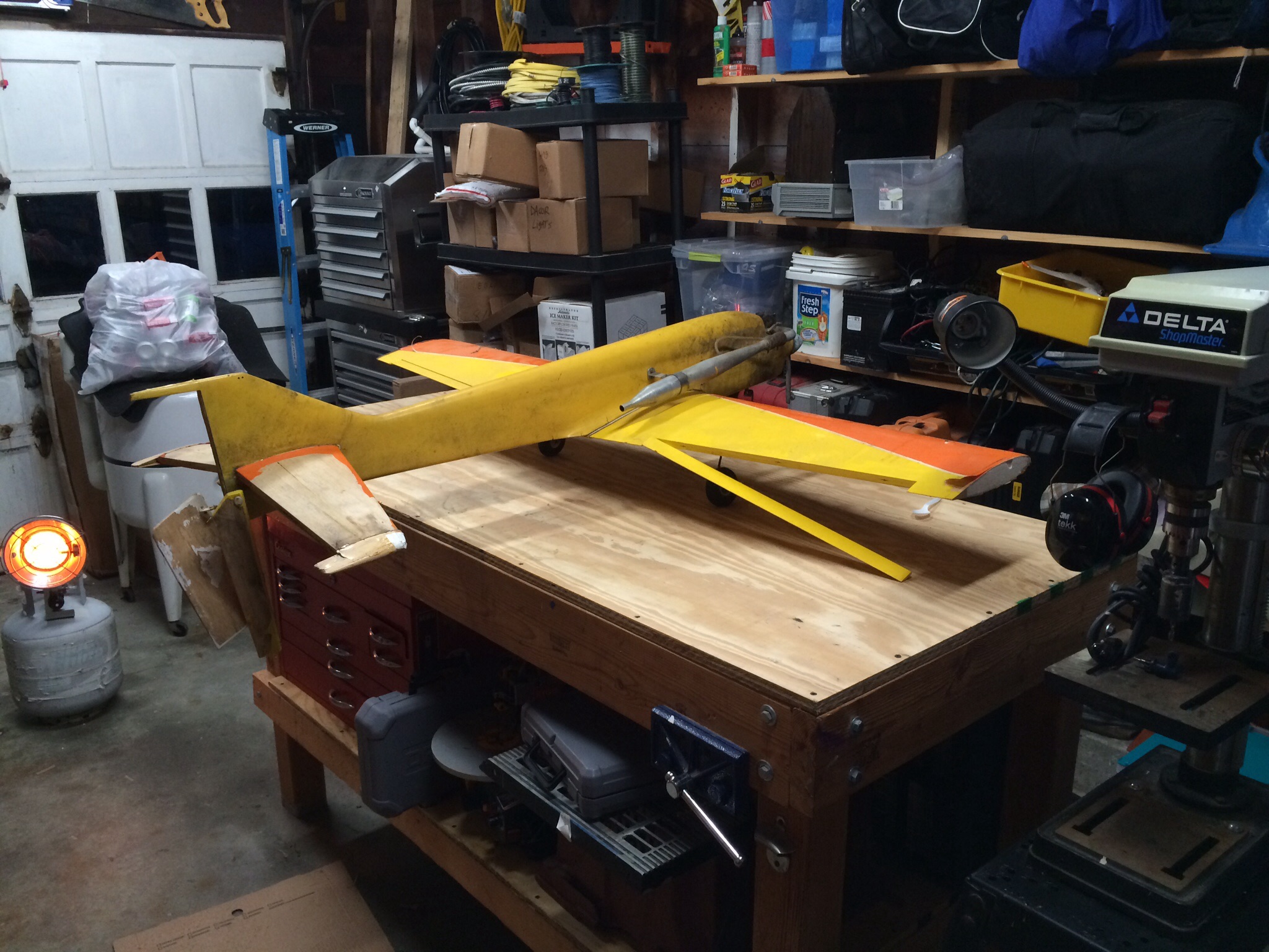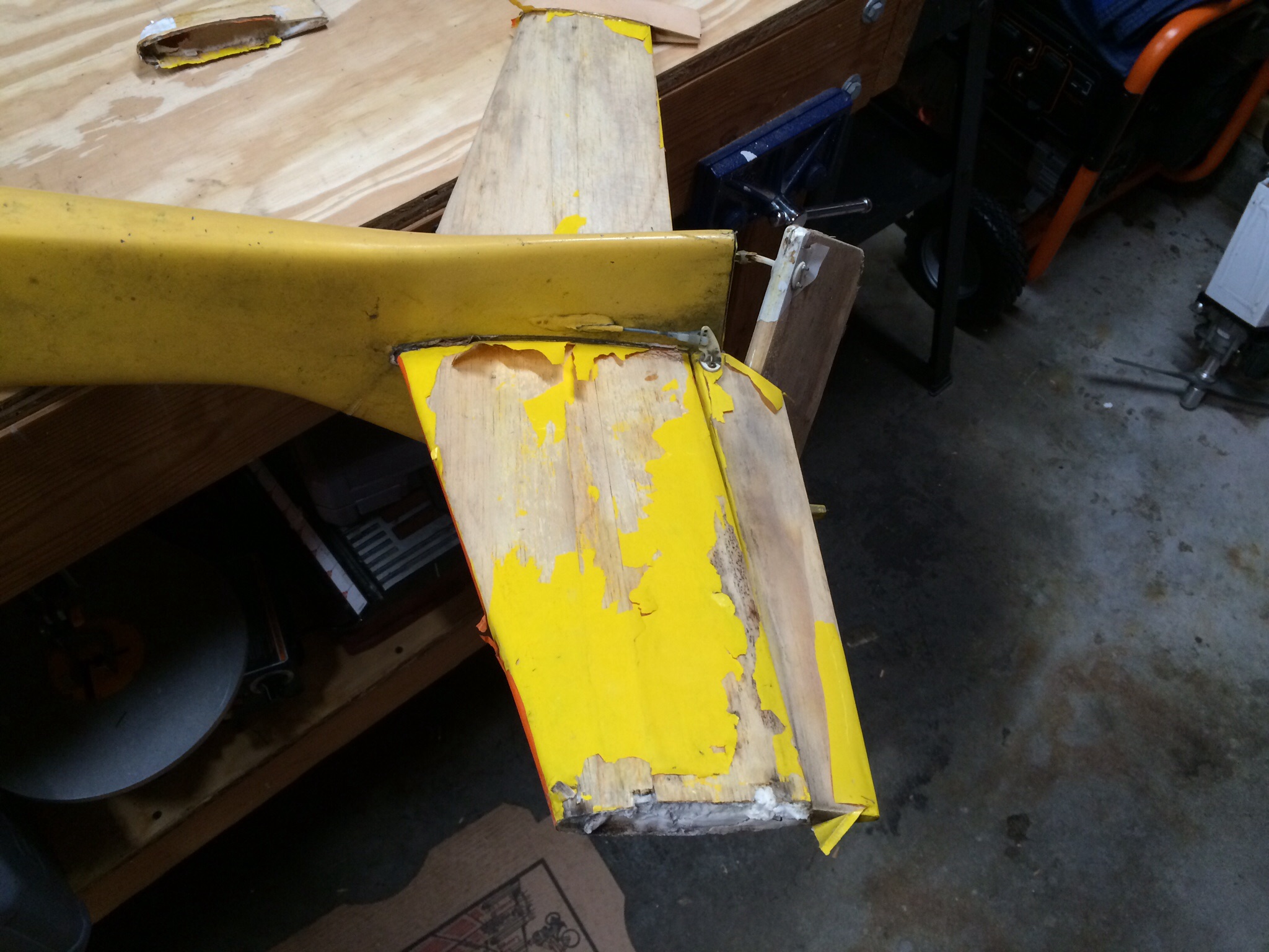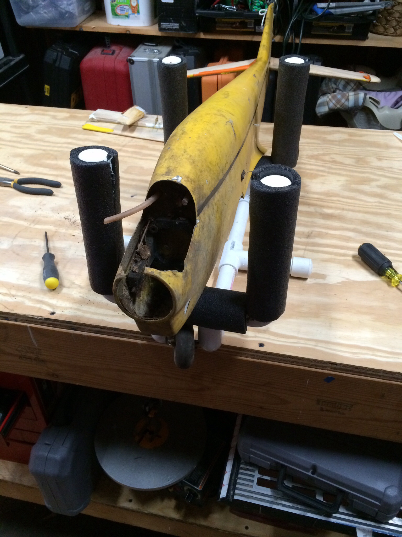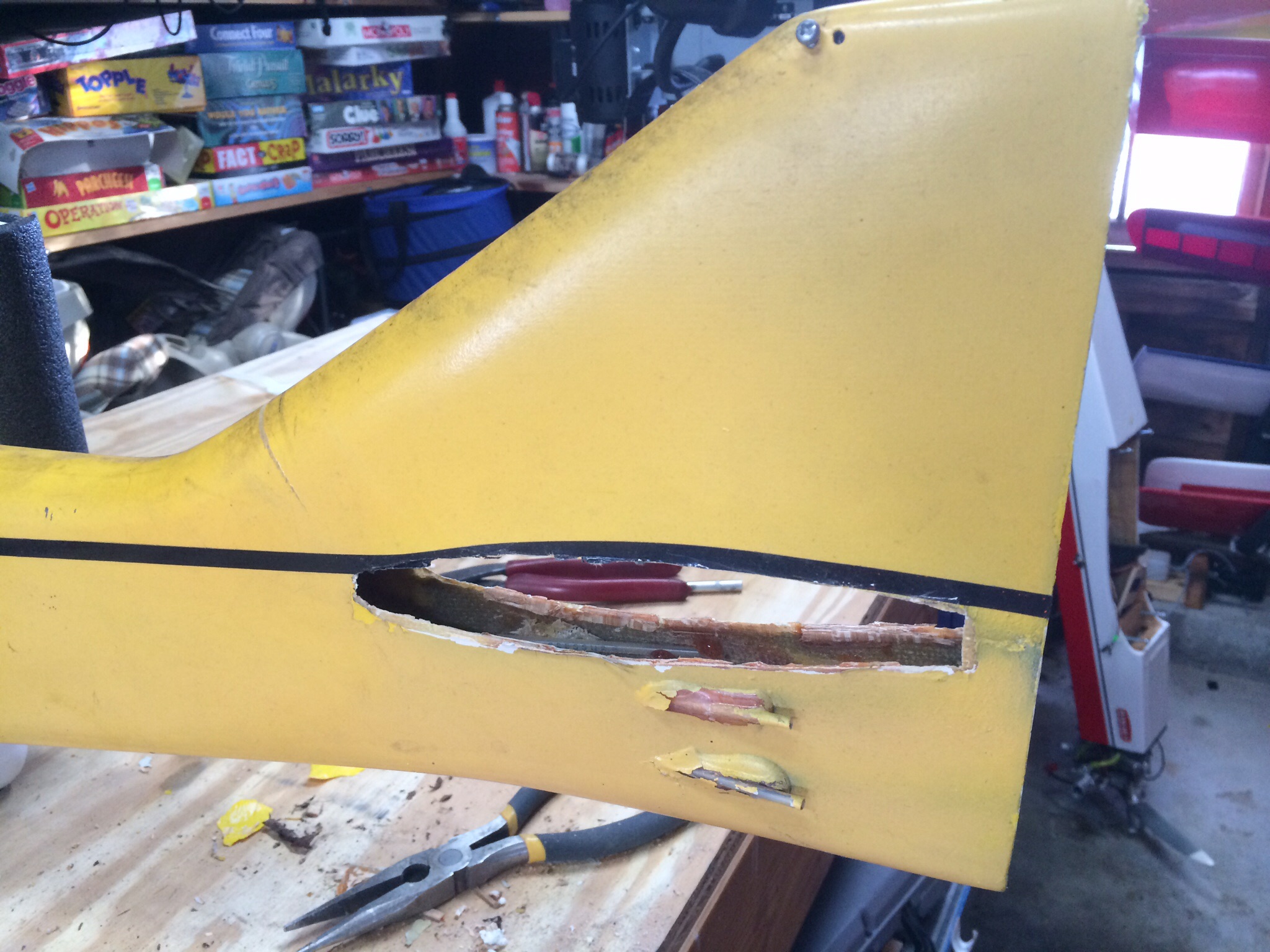 So my father starting flying around 1973 and always loved flying pattern. In 1991 he purchased a Greatplanes Tiporare from Rays hobbie in Warwick, RI. In 1993 my parents split up and he sold off all his gear to Nancy's Hobby in Warren, RI. He passed in 2004. The hobby shop owner passed in 2010.....So I received a call from the late owners wife last month that while cleaning out the basement of what used to be the hobbie shop, she had stumbled upon my fathers old plane and asked if I wanted it. So I jumped at the chance and grabbed it from her. Twenty years of sitting in a basement has taken its toll. So I'm planning a full restoration to get it back to flying condition. It's going to need some fiberglassing and a new stab but it's very doable.