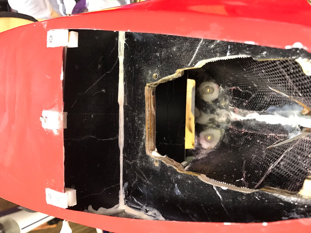 Once the trimming is complete, install the motor assembly,prop and spinner and be sure all is aligned properly and satisfactory. Thenmark the locations for the throttle control cable and fuel tubing openings onthe firewall. Remove the motor assembly and drill the appropriate holes for thethrottle control cable and fuel lines.