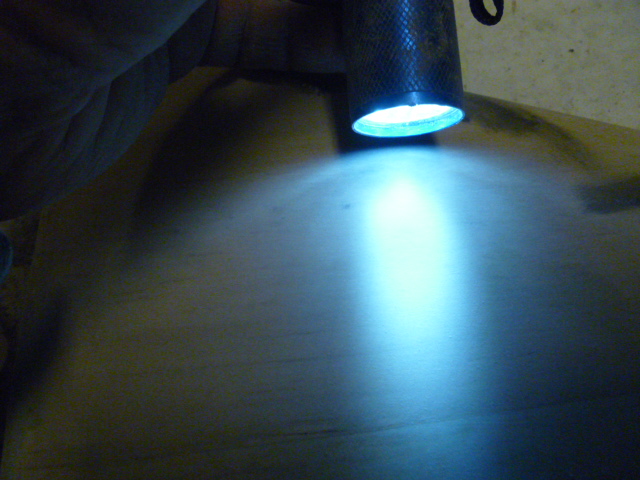 Here you can see one off to the edge of the light. It looks large in the picture, but was actually very small. If I see anything that remotely looks like an unfilled grain or microscopic pour I fill it with glazing putty. The glazing putty sands so fast, my opinion is "why not fill it". If it took some putty, fine, if not, no time wasted.