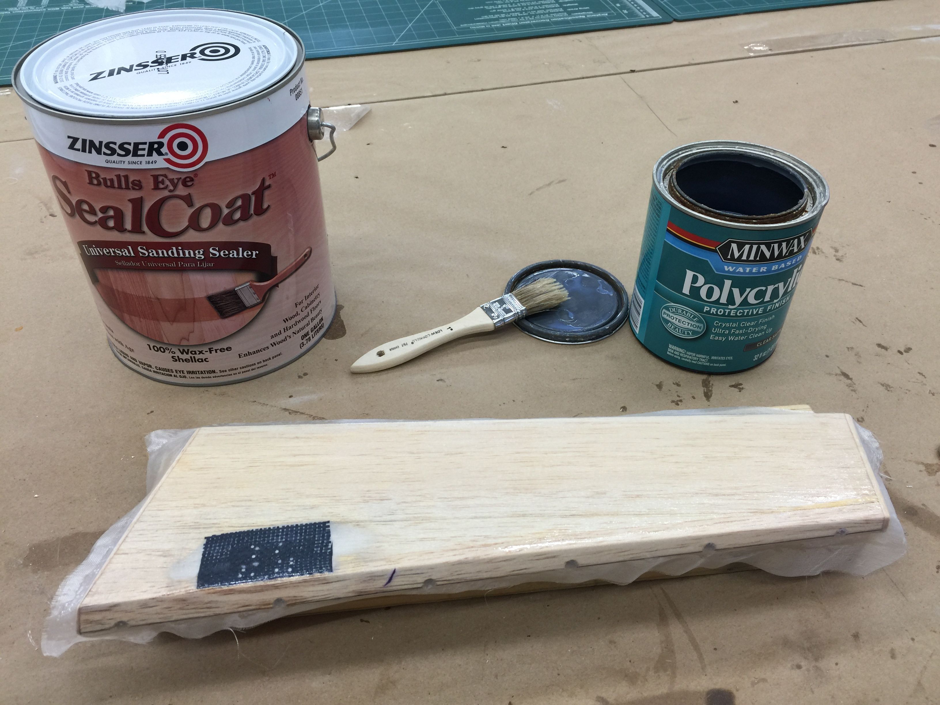 One coat of Zinsser Seal Coat to seal the wood surface followed by light sanding to smooth the raised grain.
