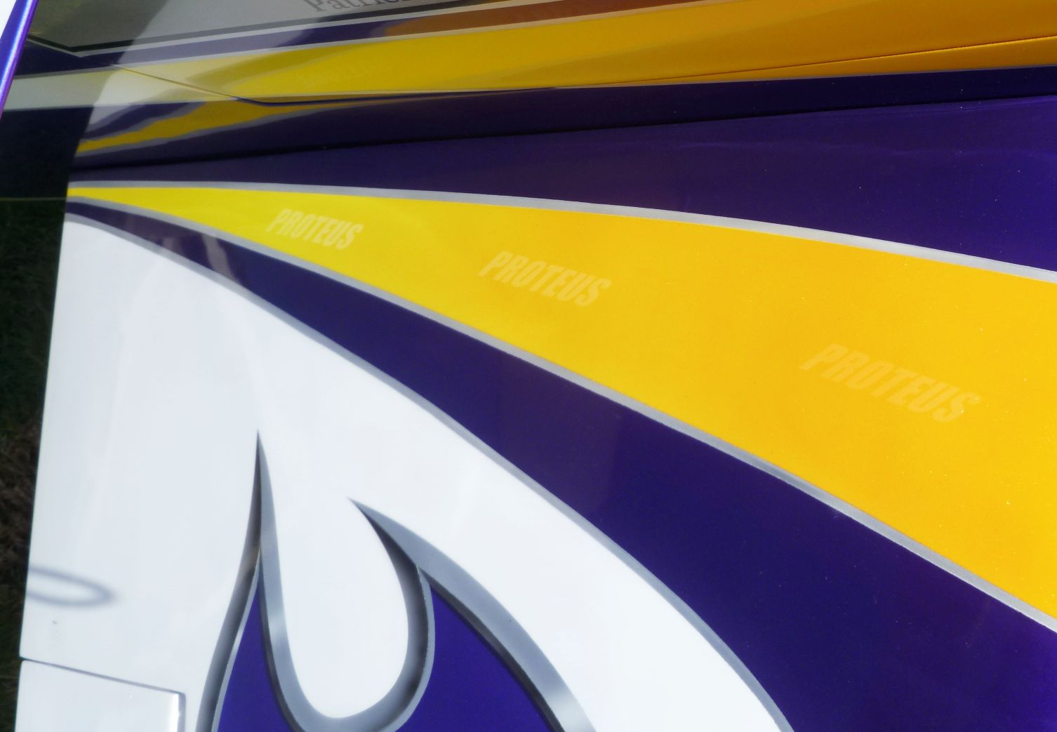 You can see in the attached picture a very small overlap of the silver pinstripe onto the adjoining purple paint on both sides. I prefer to shoot a dark color over the lighter color, but you can see it works fine both ways. Now this picture was taken before the clear was shot. After the clear is applied and cut back (leveled), you will never see or feel the slight overlap.
