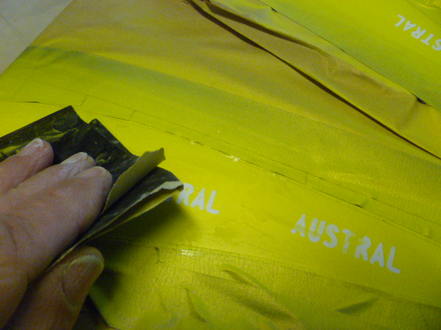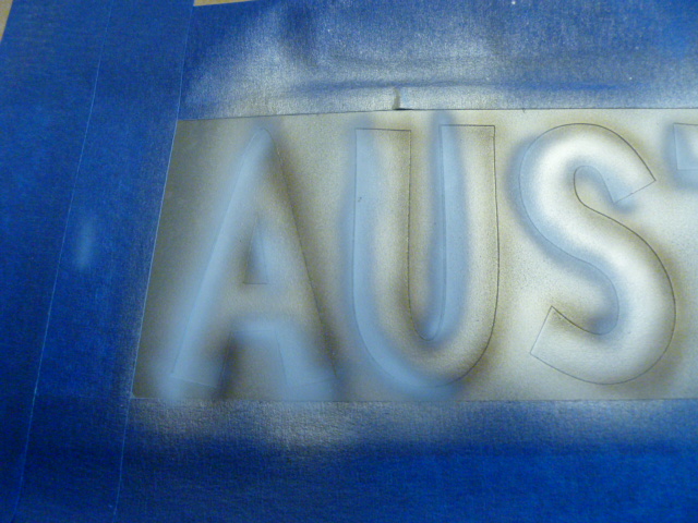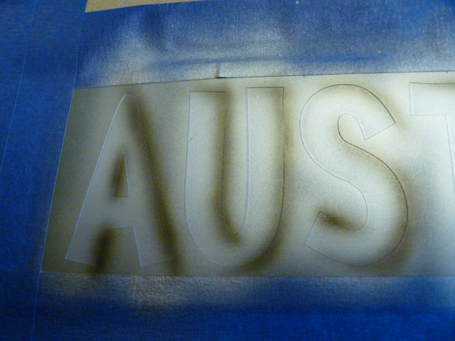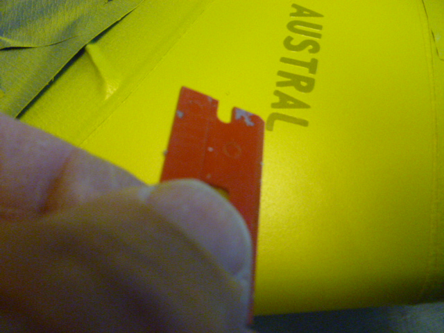 I cut the name of the plane "AUSTRAL" on my plotter and applied the positives (the letters) to the band that will be painted yellow. I also added one on each wing tip. These are applied over a white base and we then shoot the yellow right over the top of them.
