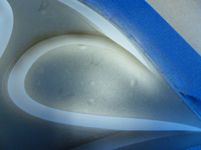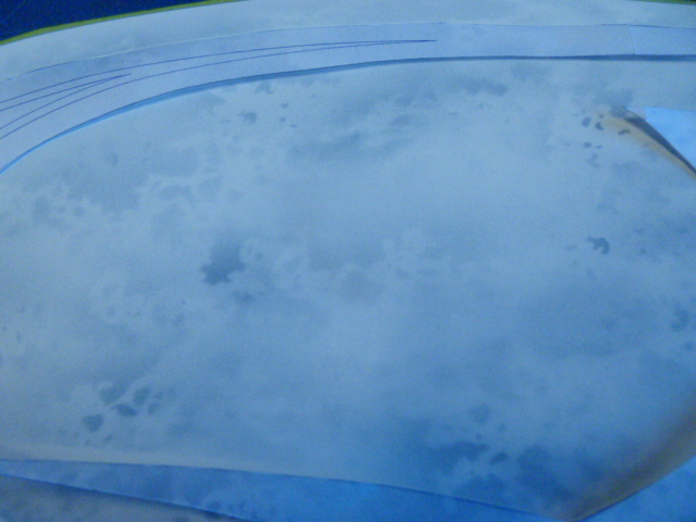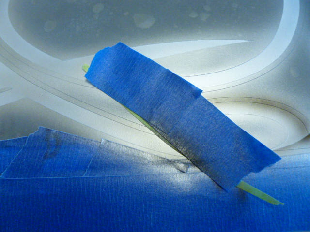 I then lay out the masking film and put a piece of tape across the center. You can see that the larger 1/4 inch section has been removed. This will become the outside bevel.
