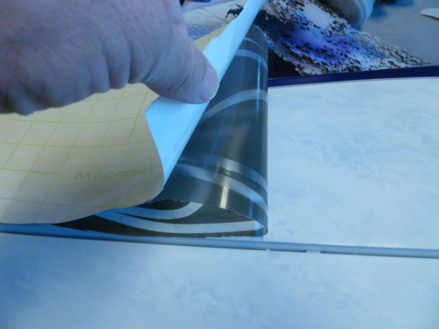 I pull back half of the graphic and peal off the paper back and lay it down on the surface.