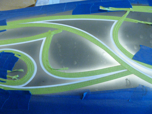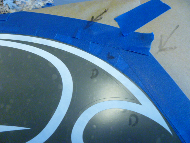 Here I am laying out the bands that will surround the graphic. One important thing about laying out tape is the hand holding the tape roll is the one doing all the layout (the work). The other hand, just presses the tape into position.