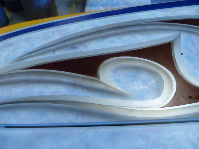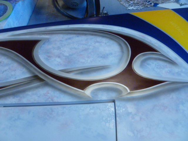 Just for fun, let's go over the cool psychedelic butterfly I posted a while back. A few moths ago I was Googling for companies that sell Vector Graphics and ran across a firm (forgot who they are) that was giving away five graphics free to entice you to buy more from them. I was really surprised that two of the five were images that would fit perfect on a paint job I was doing at the time. One of them was the butterfly. It literally took seconds to size it and cut two mask for the tail on a Proteus. You can see in the picture I just airbrushed yellow around the perimeter, orange was next and purple in the middle and the antennas.