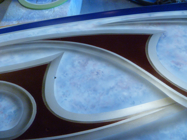 Keep in mind if this was a true raised bevel, the 1/4 inch portion would cast a shadow on the center part of the graphic (red) here is mask and paint that shadow.