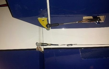 Horn: Sam Turner style. Dowel drilled and tapped for 4-40. Hole in rudder cut with brass tubing "saw", same diameter as dowel. 4-40 threaded rod with 4-40 strip aileron fittings make the actual horn.
