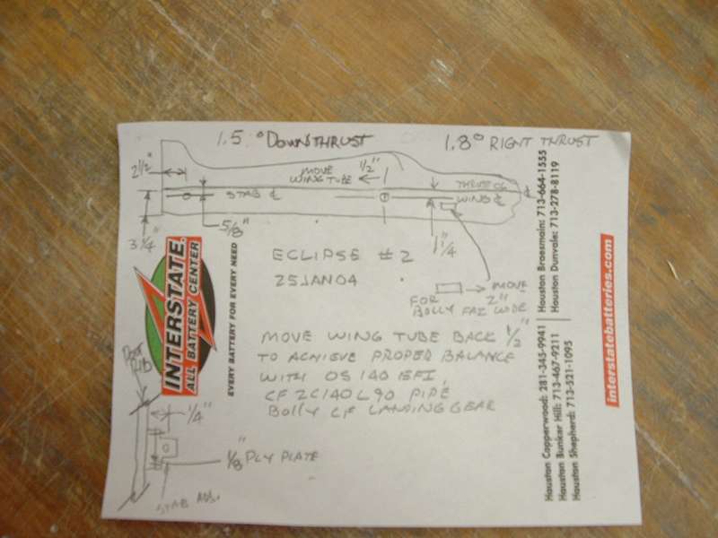 On this Eclipse, I have moved the wing tube back 1/2" to achieve proper balance when using individual elevator servos. On my first Eclipse with the pull-pull cable on elevator and the wing tube at the standard location, I came in very tail heavy. I had to put the battery on the fire wall and still had to add 3oz of lead in the nose. Moving the wing tube 3/8" would have solved my problems. My 1/2" move allows for the extra weight of individual elevator servos. I do keep the weight down by using the BPG CF wing tube and the bolly FAI landing gear. These two changes saves 4 to 5 oz in weight. All in all, I project the weight of the plane to come in between 10# - 0oz and 10# - 2oz.