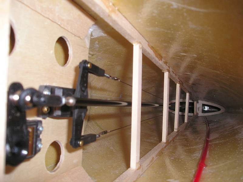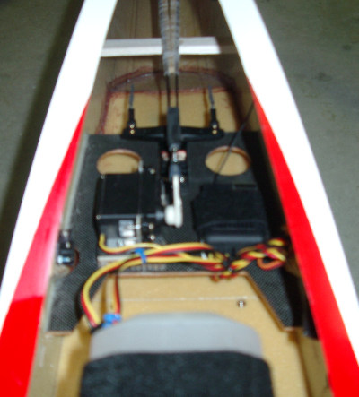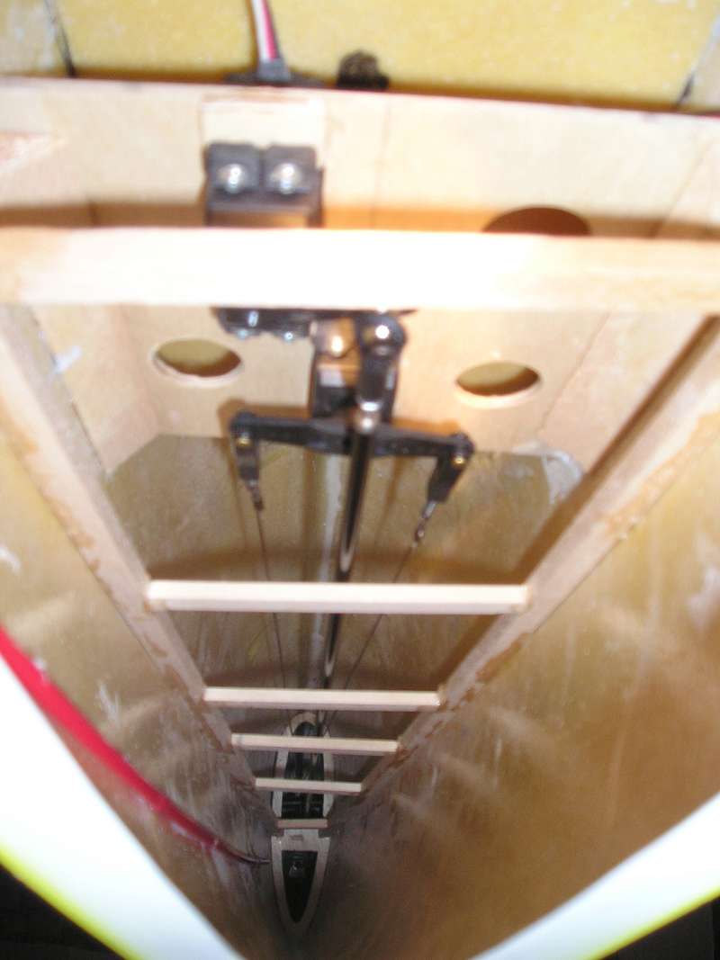 I lifted the tray and put rudder and elevator servos on it -- so it was between the wings. I make sure there is a brace between the back of wings on all aerobatic models in case I ever accidentally touch a wing tip (translates load through to other wing rather than breaking fuz).