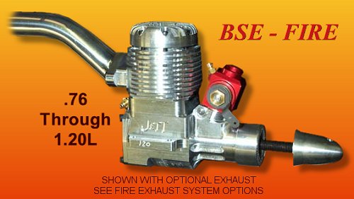Although Dub does make an awesome "90" engine, the SJ-90L and BSE-90L, the Jett BSE-100 and BSE-120 were designed from the ground-up for pattern/3D/scale applications. They turn larger props at lower rpm. All 3 engine are "60" size cases, and they match the mounting dimensions of the OS91FX. Any of the Jett engines are available in either side or rear exhaust configuration. The BSE-120 FIRE version, engine only and spinner nut, weighs about 21oz.