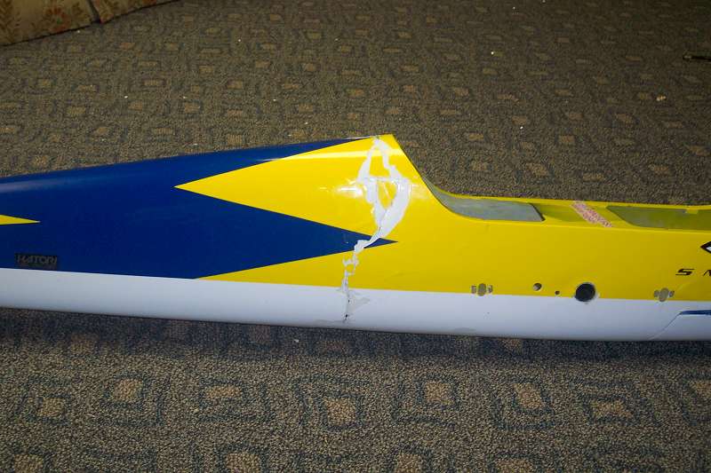 Does anybody have any experience repairing fiberglass fuses that have broken in half? Also, can anybody tell me why my YS 110 would progressively be getting worse and worse fuel milage, to the point that I ony got maybe 6 minutes max of flying at half throttle with a 16 oz tank before it ran out of fuel and this happened? It wasn't rich at all, just a little smoke. I'm running 30% CP hmm......