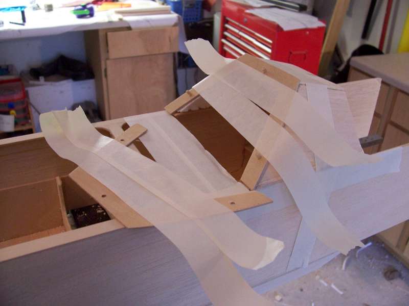 I sanded and fitted the rear part of the canopy to allow for two pieces of 1/16" ply (mating faces). I glued them in place and taped the whole canopy in place for the night.