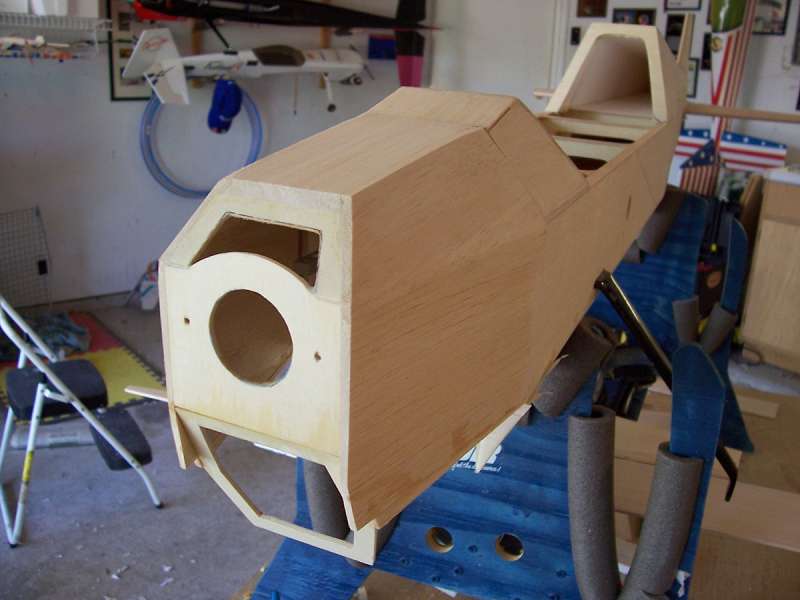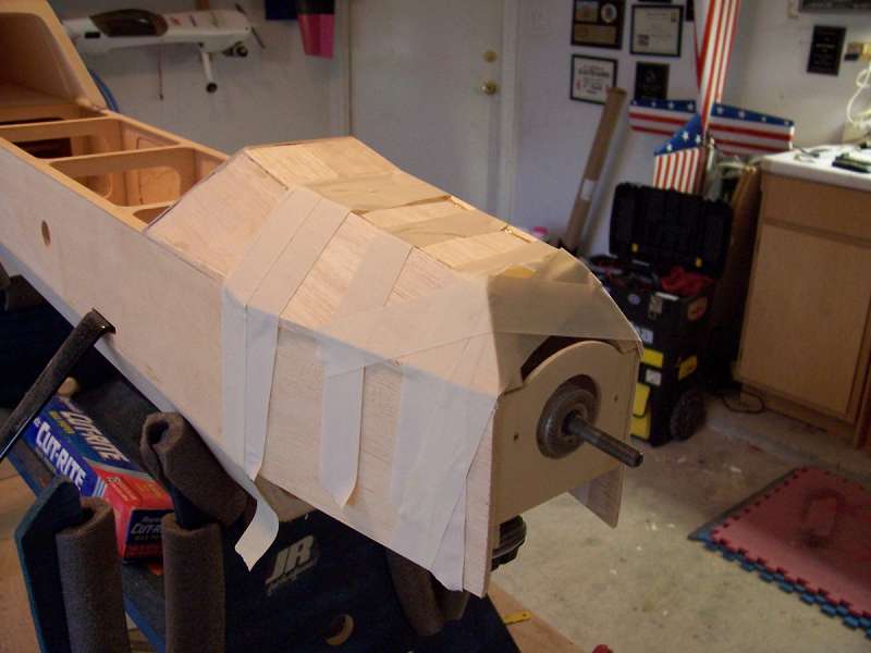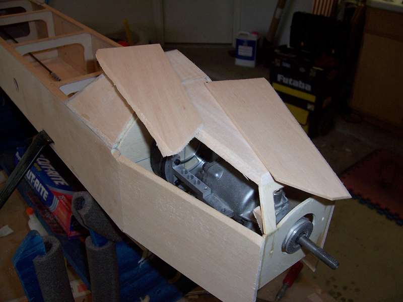 I mounted the motor (rear lugs only) to the iso mount and then setup a washer/spacer to allow clearance between the spinner backplate and F-1 (nose former). I tack glued F-1 to the back of the spacer/washer set and bolted it to the motor. I then carefully pulled in the fuse sides and glued them to the sides of F-1.
