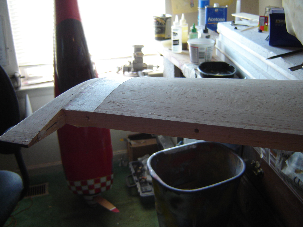 I joined the wing halves after carefully MARKING the wing bottom at the roots left and right respectivly. ..this basically allowed me to attempt"to bevel the correct angle at the root of each panel well at least I CAREFULLY blew the dust out of the foam cores before applying the 30 Min. epoxy. Once the wings were joined with the epoxy still set up I went for two canbon prods that I purcashed from Central Hobbies:the plan was to tape them in place parall with the cord line at each wing tip. but as with about half the stuff in my shop they were lost [