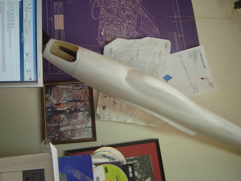 As pictured please note the 'wax paper' seperating the wing from the fuselage used when "blending in/fairing the rear fuselage wing juction. So next its out with the Zap finishing resin and (brown) fine grain Micro balloons and please note since I can not get EITHER Dave Brown or Prather Products for this quality building material I mail ordered from www.Fiberglasssupply.com