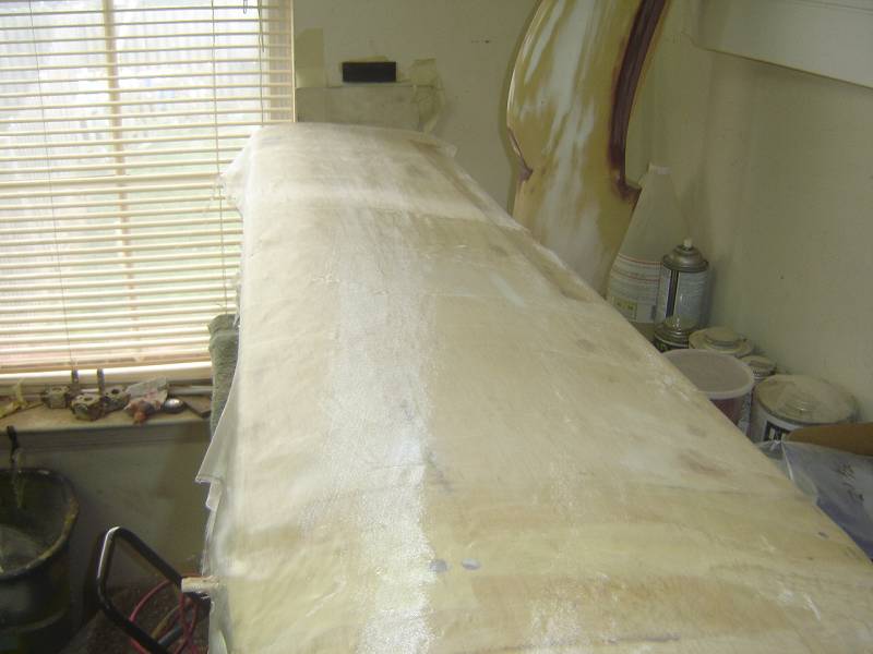 Got to the glassing stage and started with bottom left. It is so easy once you establish a techique and NO BODY WANTS TO DO EXCESS SANDING so I like the method I go with in most glassing jobs,that is pouring on a bead of resin chord wise and pull out a deck of cards and spread it on go slow giving the resin "a second or two "in order to impregnate the glass cloth and lay it on down . Remember to chech for puddles of resin and wrinkles...