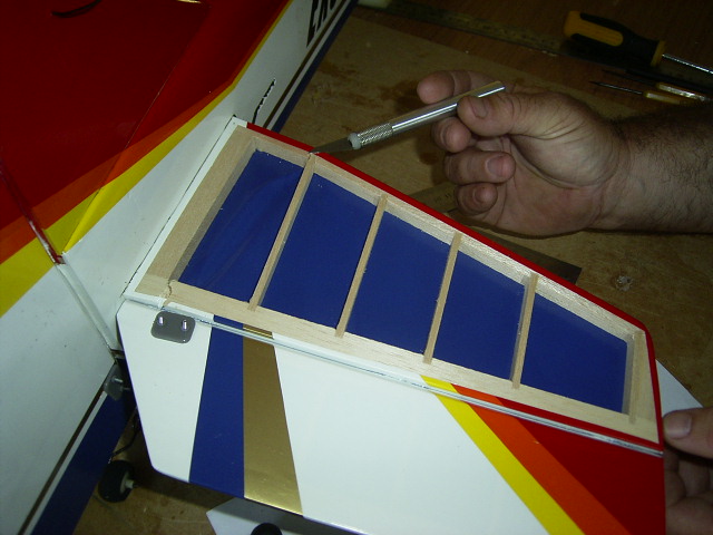 I might suggest that the damage you see in the stab on yours is the result of elevator flutter if you used the supplied linkages. The ones in the box were some of the poorest material I've ever encountered. Very soft and flexible with very bad geometry required to make it work at the rear exit locations.