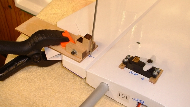 The "setback" for the jig is 5/16" from the edge of the elev. leading edge angle. Adjusted for perpendicular to chordline, pilot drilled, then drilled through with 1/8", thin CA the hole. When cured, drive the 6-32 SS Sullivan screw flush with top surface. On bottom, put drop of permanent loctite on threads, then tighten down reversed 6-32 blind nut.