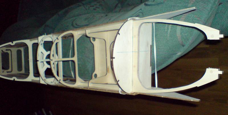 glued the plywood that makes the nose togehter and joined the fuse with almost all the formers with rubberbands!