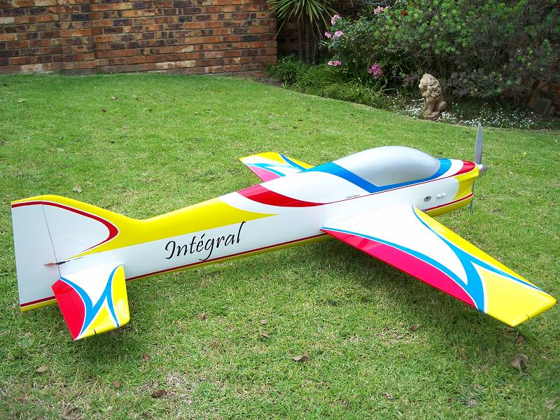 My Integral is now completed and awaits her maiden flight! See picture attached... The power plant is still an OS 140RX with a Webra Tuned pipe attached... The CG is curently just on the 170 to 175 mm mark and any suggestions here would be appreciated? Also, are there any traits I need to worry about for the first flight as this kite will be my first 2x2 experience from my trusty Leo 110...