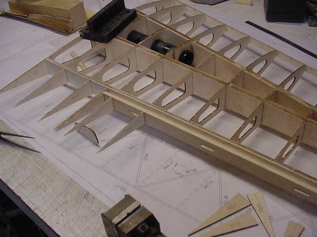 The kits contain the plans, ribs (3/32"), spars (1/4"), web shearing (1/16") and root ribs / doublers (1/8" lite play).