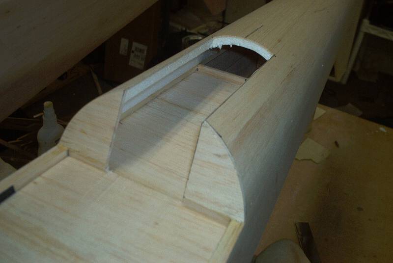 You want to carefully trim away the excess wood around the cores, you can use a #11 blade, just cut it as close as your comfortable, then go at it with a sanding block, you just need to get a clean and flat edge. I used a cool little trick, run two strips of masking tape along the edges of the sheeted core - this will help set the edge of the core slightly inside the edge of the fuse sides - - so when you block sand the fuse/turtle deck joint you can start a gentle radius.