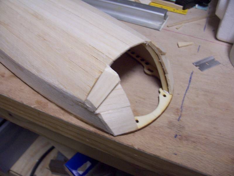 With the motor in place, I then installed the F1 former in the nose. Notice I add some scrap 3/8" balsa between F1 and F2 (nose ring former). This is mainly done to fill in small gaps that exist in this area. The additional strength gain doesn't hurt either.