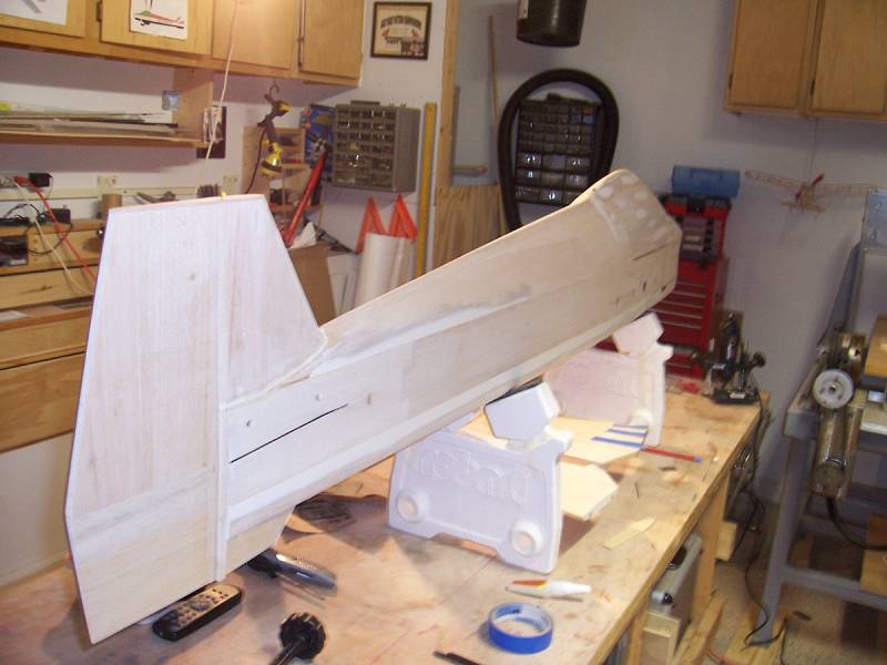 One more critical item while the fuse is still flat and straight on the workbench..the vertical fin. You will have to let the very end of the fusebox hang off the work table to clear the tailpost that is attached to the verical fin. The fin can be glued in place.....measure twice!..or more.