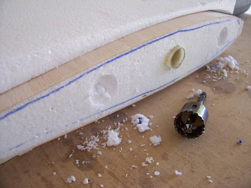 You may recall, the wing panels were still lacking the root ribs. I installed the wing panel on the fuse without the root and used a pencil to trace the fuse side profile along the top of the wing. I simply hold a pencil against the side of the fuse and drag it from T.E. to the L.E. Make sure you are about to remove the same amount of material from each panel....try to keep your wing panels as identical as possible...for obvious reasons. I cut along this line, but not thru the wing tube sleeve. I hand cut my way around that, leaving about 1/8" sticking out from the foam to engage the wing tube hole in the lite ply root rib.