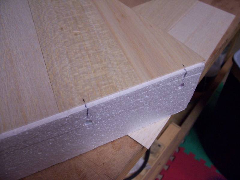 The detail drawing of the stab layout will show an offset at the leading edge that can be transferred to the top of the shuck. Another way to layout the cut line at the root is to use one of the rear fusebox top or bottom pieces. This can be carefully placed on top of the cores so that it's centerline (fusebox top will have this line) is parallel to the stab root edge. Notice that I drilled a small hole near the front of this piece to see through to my parallel line on top of the stab shuck. Move the wood piece so that it begins the cut right at the trailing edge of the stab root. Now mark this line.