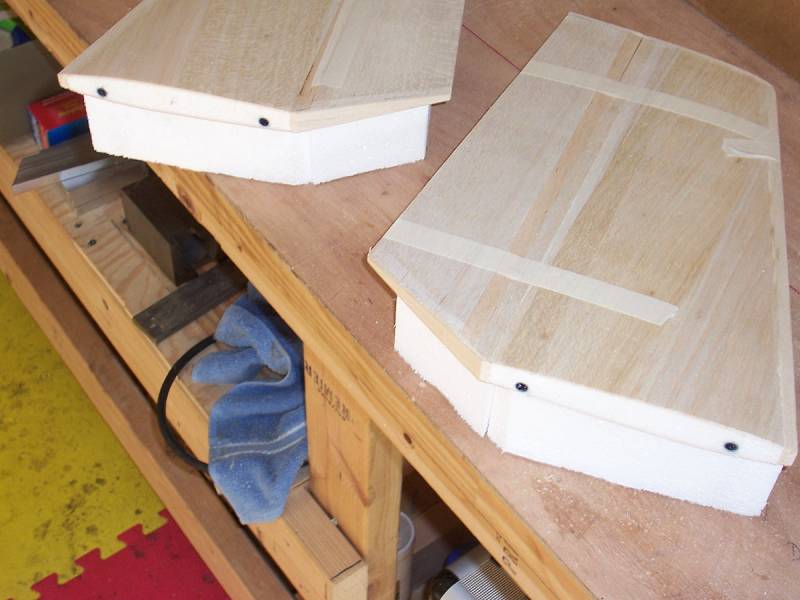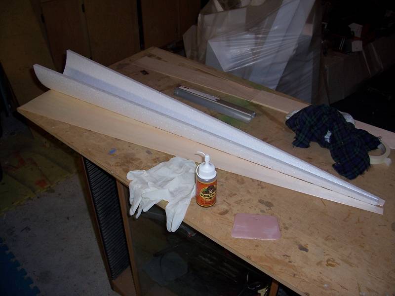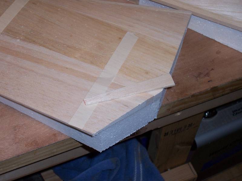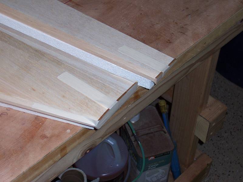 The balsa caps can then be glued on, including the leading edge material. I use a small amount of polyurethane glue and tape the balsa in place.