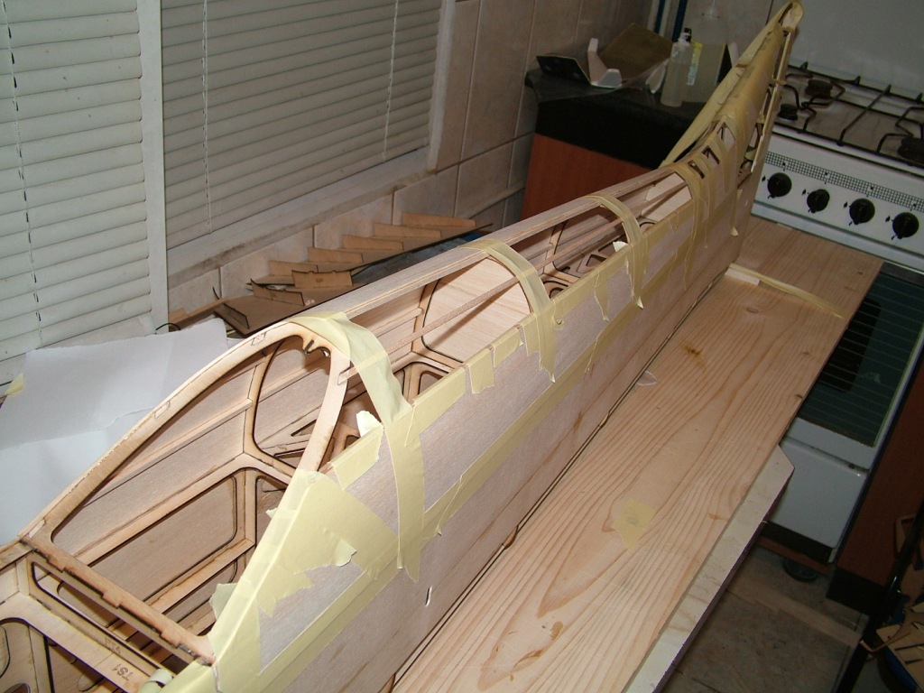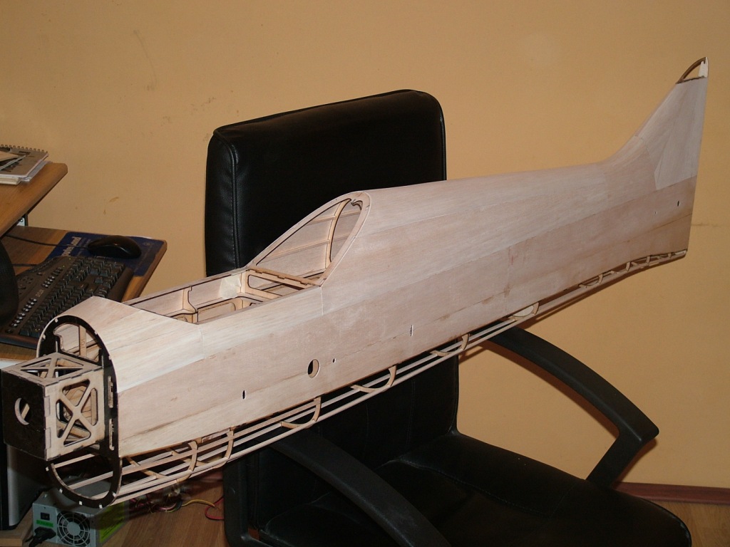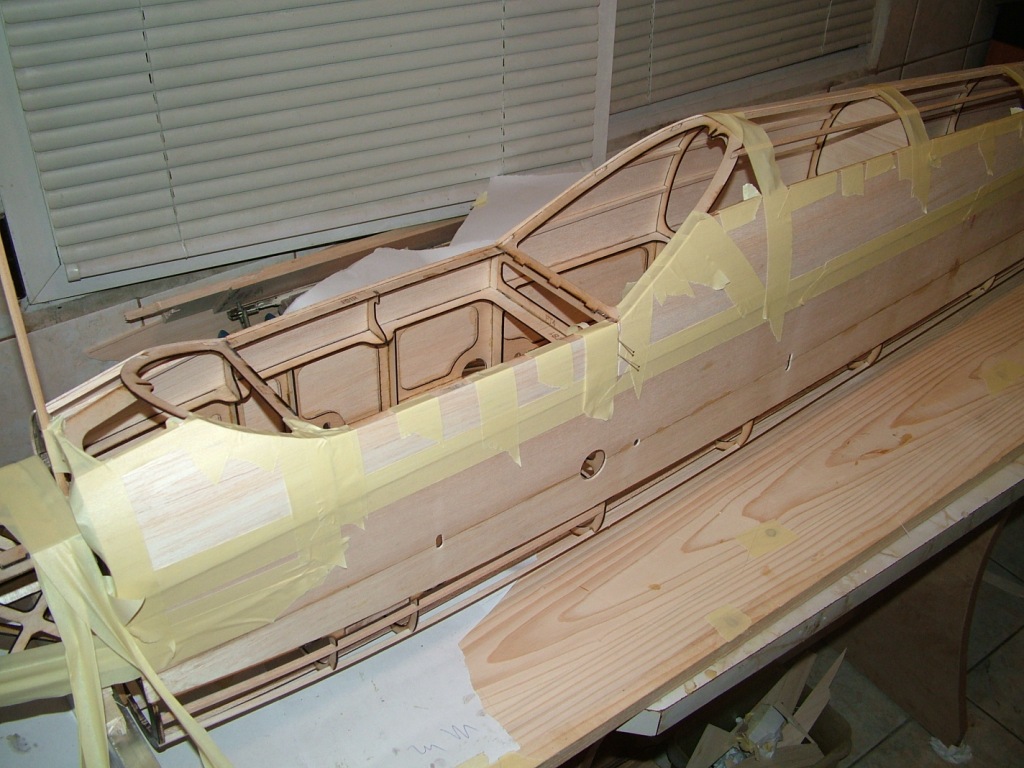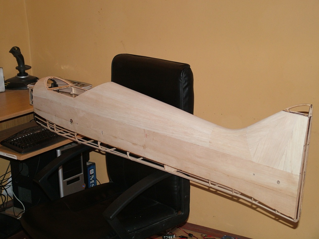 After a 2 weeks forced break, i finally found a couple of days to work on the model. I added the balsa skin to the top of the fuselage and took a few pictures to show the progress.