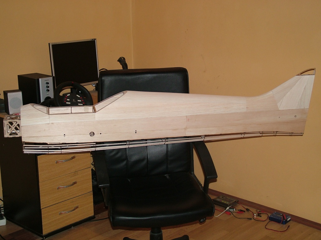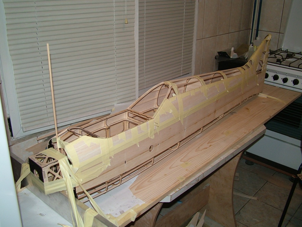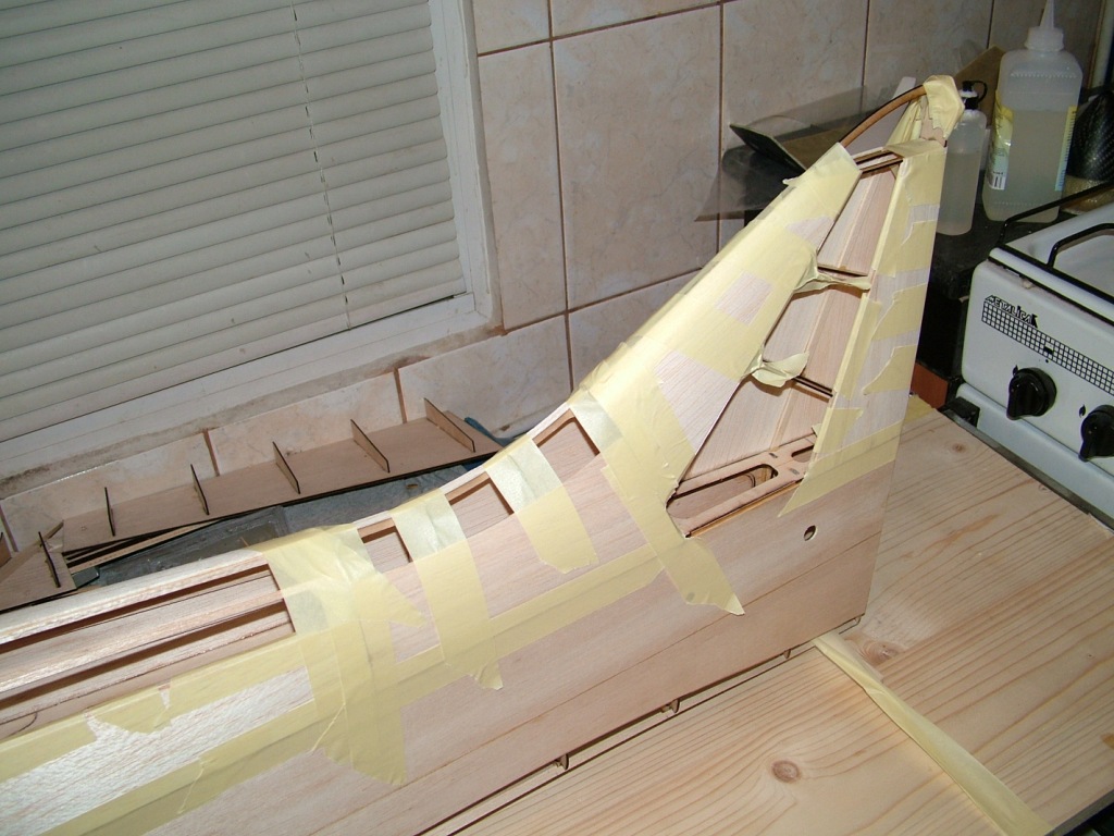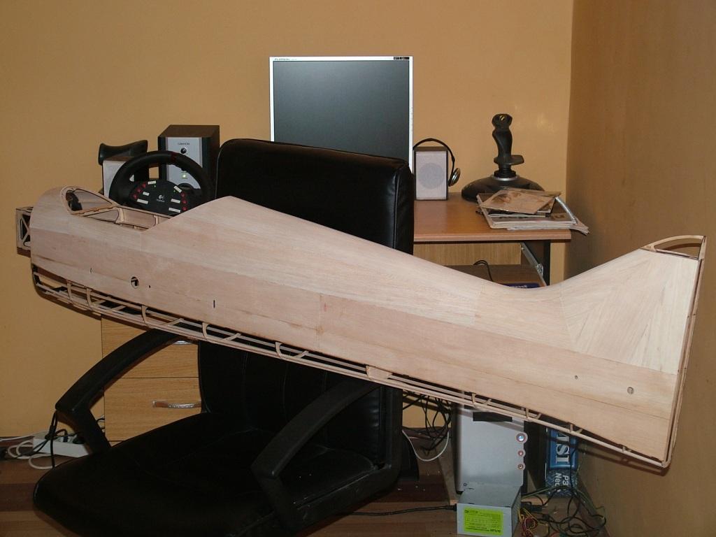 After a 2 weeks forced break, i finally found a couple of days to work on the model. I added the balsa skin to the top of the fuselage and took a few pictures to show the progress.