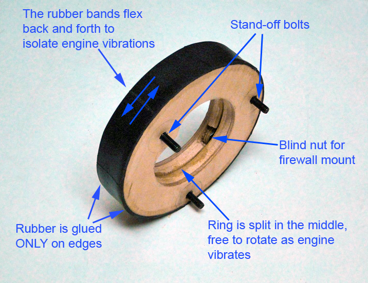 I guess I am confused how the anti vibration mount works. I thought their would be a layer of rubber between the posterior portion of the mount and the fire wall. But from looking through the pictures their is not. And, what is the function of the outer side layer of rubber? If the outer ring is solid wood, guess I don't see were the flex is coming from to take up the vibration. Sounds like you guys are getting good results with it thou. I am just curious how the thing works. From my untrained eye is appears that most of the vibration is reduced from the flex of the anterior ring mounts and then disappated through and to the outer ring. I tried the dubro anti vibration mount with my MT-35 but I don't think it was holding on to my right thrust in higher powered up lines. I needed to do something with the MT-35 because the vibration was horrible.