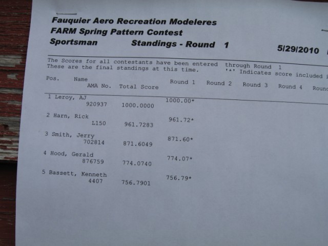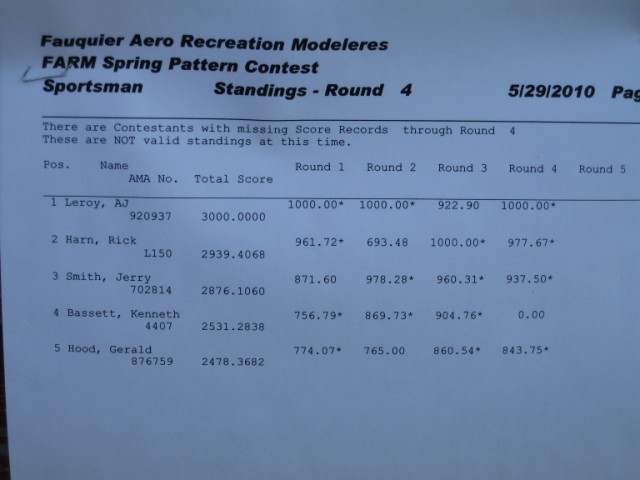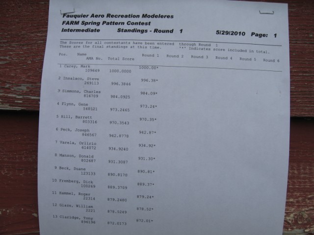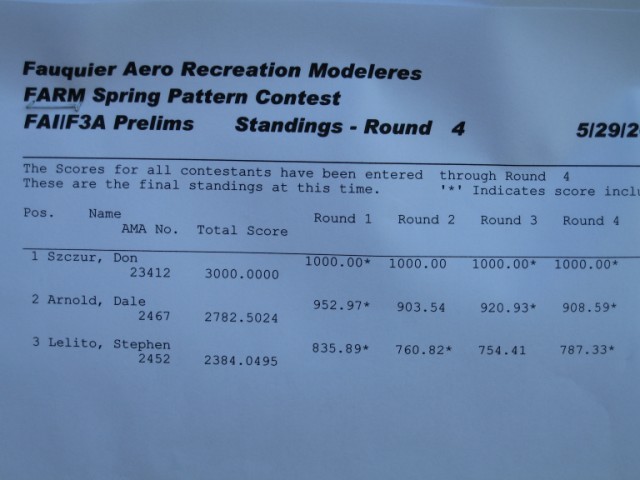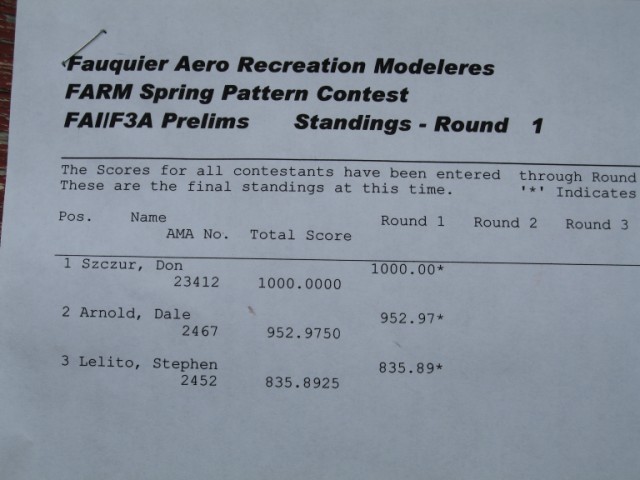 I would like to thank everyone who attended the FARM SPRING PATTERN CONTEST. As CD of the event I was very happy to see so many turn out for the event. I also want to thank everyone who made this event happen. The FARM CLUB, Bill and Nick, who kept the event moving allowing 30 pilots to fly 6 rounds and get on the road for home by 1:30 on Sunday. I better not forget my wife who helped with the scoring the whole weekend. As the NSRCA District 2 VP I am very proud of District 2. It has alot of great pilots who make D2 a great place to fly pattern. Working with everyone in the district as been a pleasure! By the way Dave Snow thanks for coming. Great to have someone that far away at our meet.