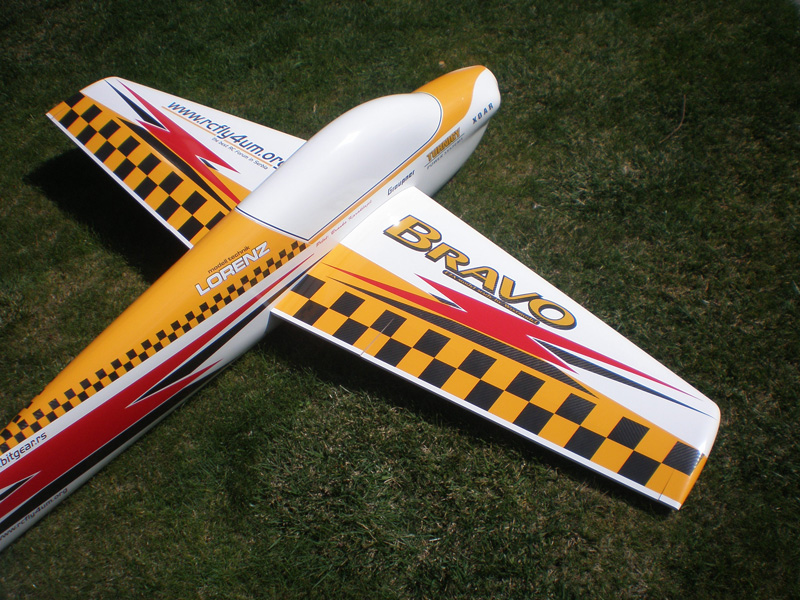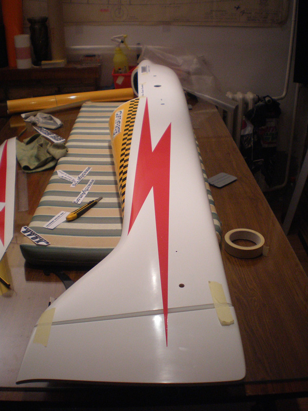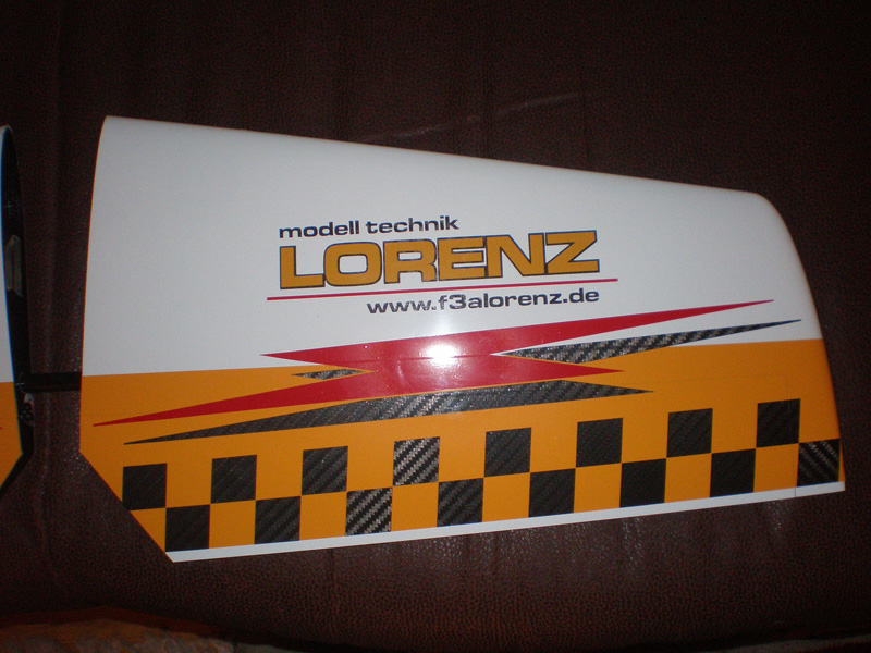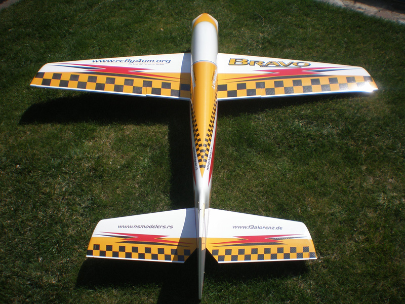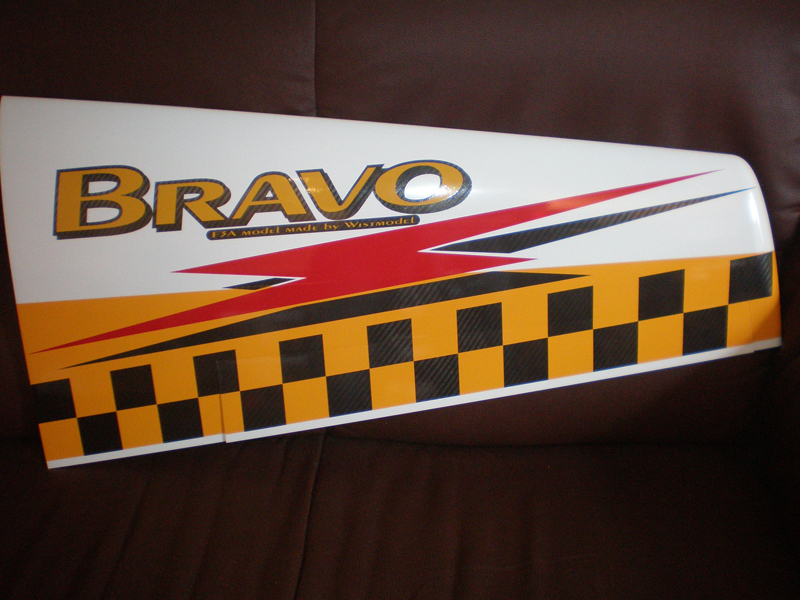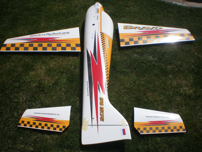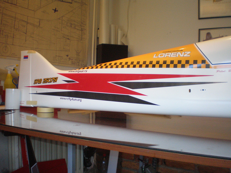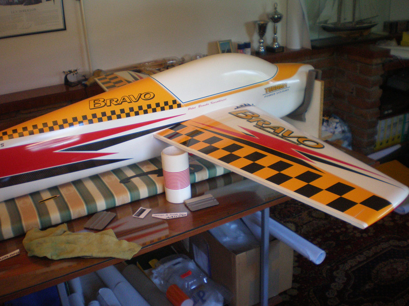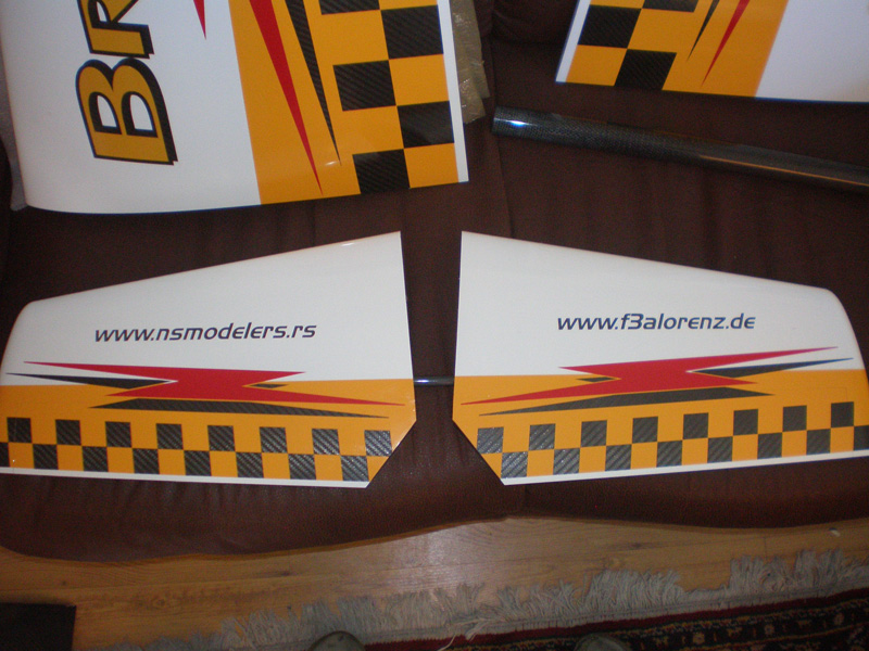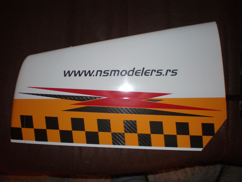 He bought it from Lorenz Modell from Germany. Model was white, and I have job to design and made finish on this model. Model are extremely easy, so painting it wasn't option, because first must add primer, than color, and everything must be paint with clear cote. So many layers will add to much weight, so we decided to made finish with self adhesive foils. Self adhesive foils are grate on flat surfaces but it can't be apply on rounded shapes. So, I must create design which will match with model... On Bravo upper surface and complete fuselage are white, and botom side of wings and elevators are red. My friend have wish to color scheme be totally different on upper and lower side. But before story about color scheme, look few pictures about model... Bravo is last generation in full composite F3A model... Attachment 2236439 Attachment 2236440 Attachment 2236441 Bottom wing side... Attachment 2236442 Attachment 2236443 Trailing edge... Attachment 2236444 Cabin is made from thin carbon... Attachment 2236445 Attachment 2236446 Attachment 2236447 Attachment 2236448 Attachment 2236449 Elevators was made with same technology as wings... Attachment 2236450 Attachment 2236451 Attachment 2236452 Attachment 2236453 Attachment 2236454 Attachment 2236455 Attachment 2236456 Few details about landing gear... Attachment 2236457 Attachment 2236458 Attachment 2236459 Attachment 2236460 Attachment 2236461 Attachment 2236462 Attachment 2236463 Attachment 2236464 And finally fuselage... Attachment 2236465 Attachment 2236466 Attachment 2236467 Attachment 2236468 Attachment 2236469 Attachment 2236470 Attachment 2236471 OK, now when we know how model look, lets start with work. I start working on lower wing side, and apply three white stripes... I use Oracal 641 self adhesive foils. Because wing surface are plastic, very thin and gentle, I use water for applying foil. System is simple, add water on surface, add water on sticky foil side, and aplly foil on surface. Bacause foil is wet, I could position white line very precise on wing... Attachment 2236472 Attachment 2236473 Attachment 2236474 Attachment 2236475 Than I used this little tool, and squeeze out water... Attachment 2236476 Attachment 2236477 Surface are without any bubble... When water dryed I add masking foil in edges which I want cut... Attachment 2236478 Attachment 2236479 Attachment 2236480 Attachment 2236481 On ailerons I must move white line from edge where aileron come inside in the wing. Gap is so small that foil will stuck on the edge... Attachment 2236482 Attachment 2236483 Attachment 2236484 Finally, I add one red stripe on first white line to made all lines same... Attachment 2236485 Attachment 2236486 Attachment 2236487 Than I made this process few more times, and get white lines on bottom sides... Same procedure was for elevators, but for applying white stripes I was not using water... Attachment 2236488 Attachment 2236489 For upper surface I made totally different color scheme. First I draw everything in computer in Corel... I made few proposals, to enable my friend to choose colors, but for me, and for him also, yellow and black was the best combination... Attachment 2236490 I bought yellow foil, and instead off black I take foil like carbon... Attachment 2236491 Attachment 2236492 On white wing side, first I add yellow areas, but before that I put together wings to draw a straight line. For that operation I use very "high tech" tool... Attachment 2236493 Attachment 2236494 Attachment 2236495 Attachment 2236496 Gluing was again with water... Attachment 2236497 Attachment 2236498 Attachment 2236499 Attachment 2236500 Technique was same like on bottom side... Attachment 2236501 Attachment 2236502 Than I apply cubes made from carbon foil... Attachment 2236503 I used transfer foil for this... Attachment 2236504 Attachment 2236505 Attachment 2236506 Attachment 2236507 Attachment 2236508 Than I made and apply lightning shadow, which was again from carbon foil... Attachment 2236509 Attachment 2236510 Attachment 2236511 After that letters and finally red lightning... Attachment 2236512 Attachment 2236513 Attachment 2236514 Attachment 2236515 Attachment 2236516 Attachment 2236517 Same procedures was on elevators... Attachment 2236518 Attachment 2236519 Attachment 2236520 Next was fuselage... Attachment 2236521 Attachment 2236522 First yellow areas... Attachment 2236523 Attachment 2236524 Attachment 2236525 Attachment 2236526 Attachment 2236527 I add black stripe for easier cutting... Attachment 2236528 Attachment 2236529 Attachment 2236532 Than copy - paste everything on other side... Attachment 2236533 Next was front end of the fuselage... I must made paper template... Attachment 2236534 Attachment 2236535 Than I scan it in computer and finally cut on my Roland cutter...... Attachment 2236536 Attachment 2236537 Next step was easy... Attachment 2236538 Attachment 2236539 Than I add yellow and black line on cabine. Yellow line connect front and rear yellow fuselage areas... Attachment 2236540 Attachment 2236541 But, when I add cabin on fuselage I saw that in fron was big white area... Paper templates again... Attachment 2236542 Attachment 2236543 Attachment 2236544 ...little cutting, little trimming and... Attachment 2236545 Attachment 2236546 Attachment 2236547 Attachment 2236548 On the foil lap I add "warbird" details - screws... Attachment 2236549 Next steps was to add letters, lightning with shadow, and all other details... I always made letters first on paper... Attachment 2236550 Attachment 2236551 Attachment 2236552 Attachment 2236553 Attachment 2236554 But, when I put wings on, I saw that right elevator is to much color full for my taste, so I change design... Attachment 2236555 Attachment 2236556 Attachment 2236557 Attachment 2236558 Last touch was adding authors logo... Attachment 2236559 And finally Bravo in full shine... Attachment 2236560 Attachment 2236561 Attachment 2236562 Attachment 2236563 Attachment 2236564 Attachment 2236565 At