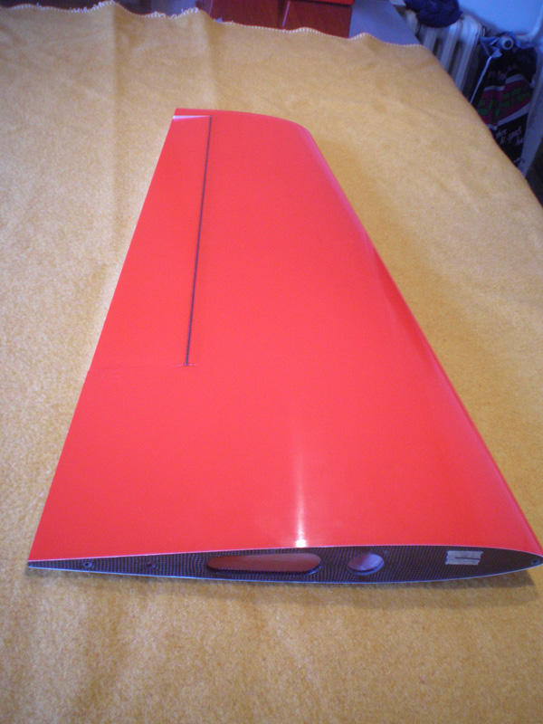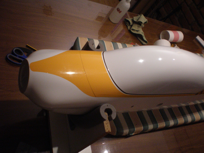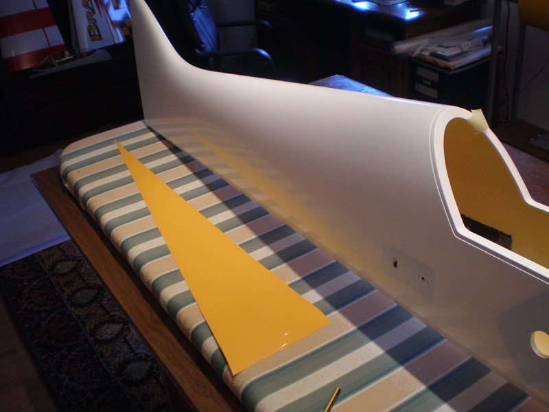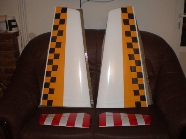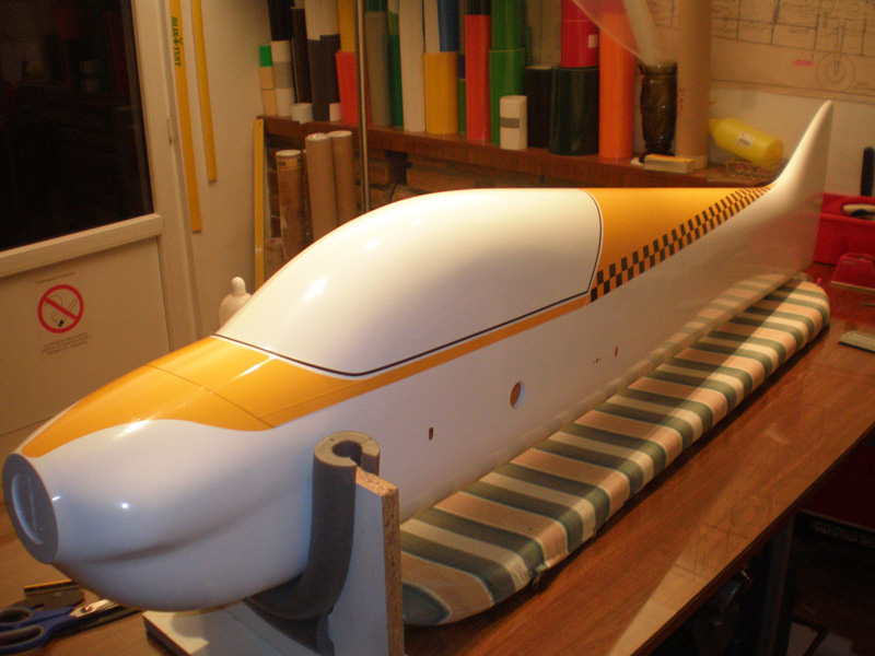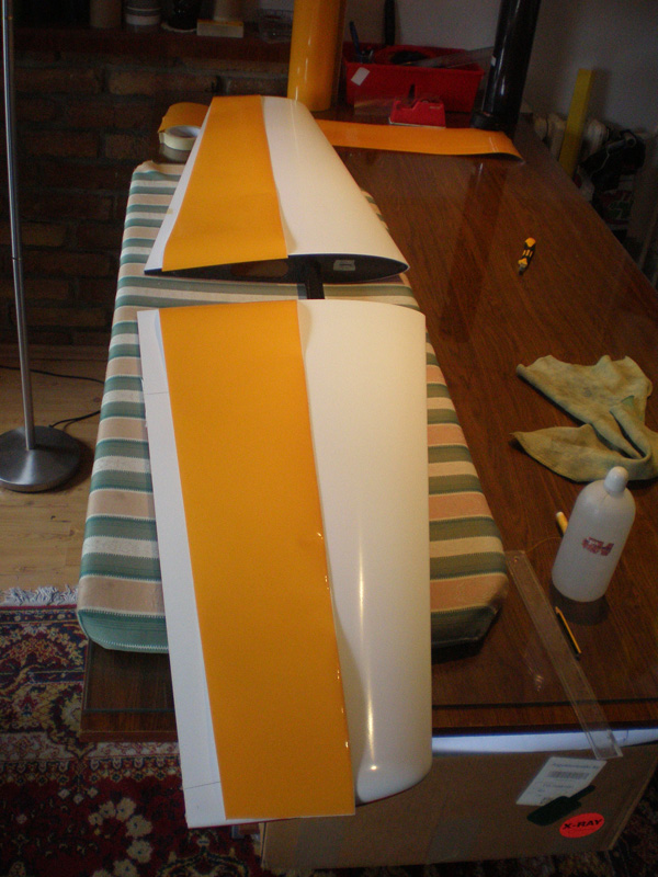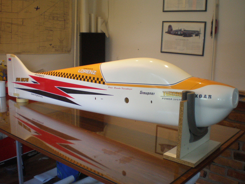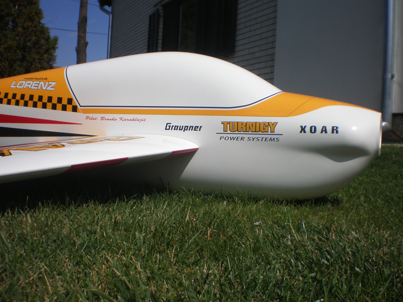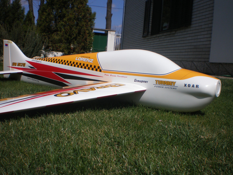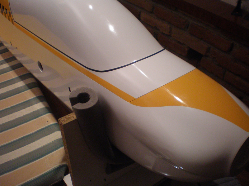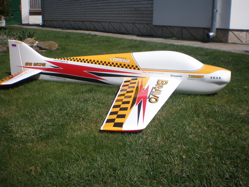 He bought it from Lorenz Modell from Germany. Model was white, and I have job to design and made finish on this model. Model are extremely easy, so painting it wasn't option, because first must add primer, than color, and everything must be paint with clear cote. So many layers will add to much weight, so we decided to made finish with self adhesive foils. Self adhesive foils are grate on flat surfaces but it can't be apply on rounded shapes. So, I must create design which will match with model... On Bravo upper surface and complete fuselage are white, and botom side of wings and elevators are red. My friend have wish to color scheme be totally different on upper and lower side. But before story about color scheme, look few pictures about model... Bravo is last generation in full composite F3A model... Attachment 2236439 Attachment 2236440 Attachment 2236441 Bottom wing side... Attachment 2236442 Attachment 2236443 Trailing edge... Attachment 2236444 Cabin is made from thin carbon... Attachment 2236445 Attachment 2236446 Attachment 2236447 Attachment 2236448 Attachment 2236449 Elevators was made with same technology as wings... Attachment 2236450 Attachment 2236451 Attachment 2236452 Attachment 2236453 Attachment 2236454 Attachment 2236455 Attachment 2236456 Few details about landing gear... Attachment 2236457 Attachment 2236458 Attachment 2236459 Attachment 2236460 Attachment 2236461 Attachment 2236462 Attachment 2236463 Attachment 2236464 And finally fuselage... Attachment 2236465 Attachment 2236466 Attachment 2236467 Attachment 2236468 Attachment 2236469 Attachment 2236470 Attachment 2236471 OK, now when we know how model look, lets start with work. I start working on lower wing side, and apply three white stripes... I use Oracal 641 self adhesive foils. Because wing surface are plastic, very thin and gentle, I use water for applying foil. System is simple, add water on surface, add water on sticky foil side, and aplly foil on surface. Bacause foil is wet, I could position white line very precise on wing... Attachment 2236472 Attachment 2236473 Attachment 2236474 Attachment 2236475 Than I used this little tool, and squeeze out water... Attachment 2236476 Attachment 2236477 Surface are without any bubble... When water dryed I add masking foil in edges which I want cut... Attachment 2236478 Attachment 2236479 Attachment 2236480 Attachment 2236481 On ailerons I must move white line from edge where aileron come inside in the wing. Gap is so small that foil will stuck on the edge... Attachment 2236482 Attachment 2236483 Attachment 2236484 Finally, I add one red stripe on first white line to made all lines same... Attachment 2236485 Attachment 2236486 Attachment 2236487 Than I made this process few more times, and get white lines on bottom sides... Same procedure was for elevators, but for applying white stripes I was not using water... Attachment 2236488 Attachment 2236489 For upper surface I made totally different color scheme. First I draw everything in computer in Corel... I made few proposals, to enable my friend to choose colors, but for me, and for him also, yellow and black was the best combination... Attachment 2236490 I bought yellow foil, and instead off black I take foil like carbon... Attachment 2236491 Attachment 2236492 On white wing side, first I add yellow areas, but before that I put together wings to draw a straight line. For that operation I use very "high tech" tool... Attachment 2236493 Attachment 2236494 Attachment 2236495 Attachment 2236496 Gluing was again with water... Attachment 2236497 Attachment 2236498 Attachment 2236499 Attachment 2236500 Technique was same like on bottom side... Attachment 2236501 Attachment 2236502 Than I apply cubes made from carbon foil... Attachment 2236503 I used transfer foil for this... Attachment 2236504 Attachment 2236505 Attachment 2236506 Attachment 2236507 Attachment 2236508 Than I made and apply lightning shadow, which was again from carbon foil... Attachment 2236509 Attachment 2236510 Attachment 2236511 After that letters and finally red lightning... Attachment 2236512 Attachment 2236513 Attachment 2236514 Attachment 2236515 Attachment 2236516 Attachment 2236517 Same procedures was on elevators... Attachment 2236518 Attachment 2236519 Attachment 2236520 Next was fuselage... Attachment 2236521 Attachment 2236522 First yellow areas... Attachment 2236523 Attachment 2236524 Attachment 2236525 Attachment 2236526 Attachment 2236527 I add black stripe for easier cutting... Attachment 2236528 Attachment 2236529 Attachment 2236532 Than copy - paste everything on other side... Attachment 2236533 Next was front end of the fuselage... I must made paper template... Attachment 2236534 Attachment 2236535 Than I scan it in computer and finally cut on my Roland cutter...... Attachment 2236536 Attachment 2236537 Next step was easy... Attachment 2236538 Attachment 2236539 Than I add yellow and black line on cabine. Yellow line connect front and rear yellow fuselage areas... Attachment 2236540 Attachment 2236541 But, when I add cabin on fuselage I saw that in fron was big white area... Paper templates again... Attachment 2236542 Attachment 2236543 Attachment 2236544 ...little cutting, little trimming and... Attachment 2236545 Attachment 2236546 Attachment 2236547 Attachment 2236548 On the foil lap I add "warbird" details - screws... Attachment 2236549 Next steps was to add letters, lightning with shadow, and all other details... I always made letters first on paper... Attachment 2236550 Attachment 2236551 Attachment 2236552 Attachment 2236553 Attachment 2236554 But, when I put wings on, I saw that right elevator is to much color full for my taste, so I change design... Attachment 2236555 Attachment 2236556 Attachment 2236557 Attachment 2236558 Last touch was adding authors logo... Attachment 2236559 And finally Bravo in full shine... Attachment 2236560 Attachment 2236561 Attachment 2236562 Attachment 2236563 Attachment 2236564 Attachment 2236565 At