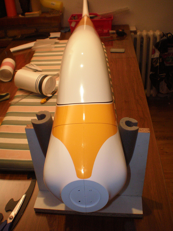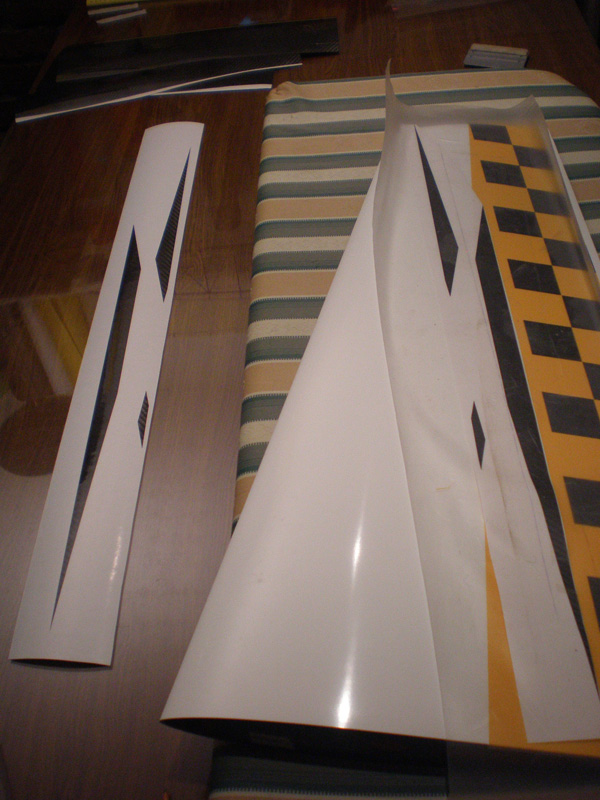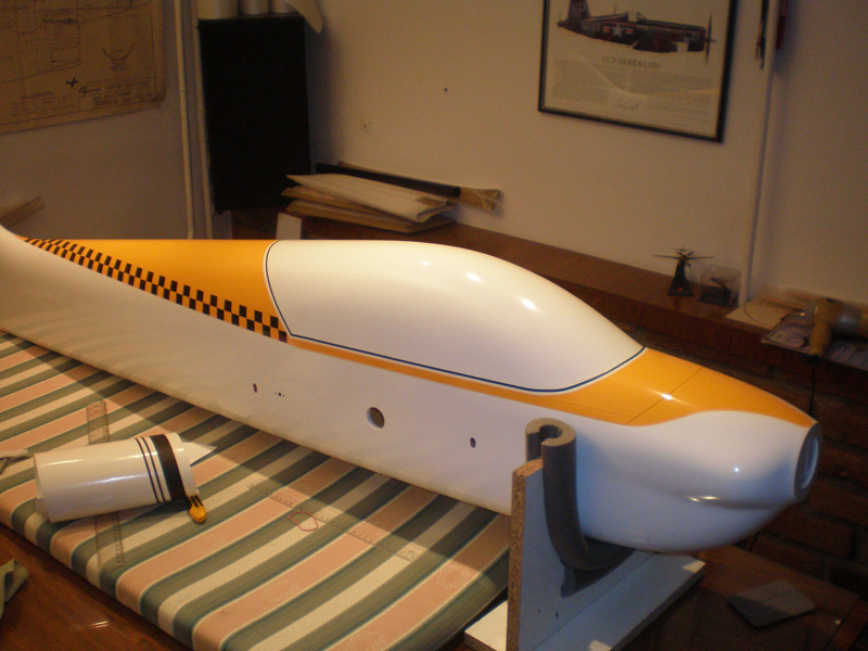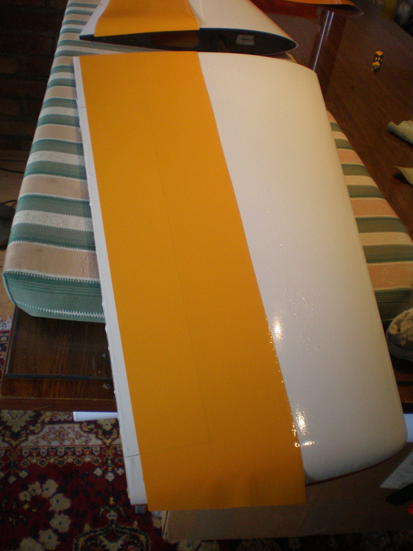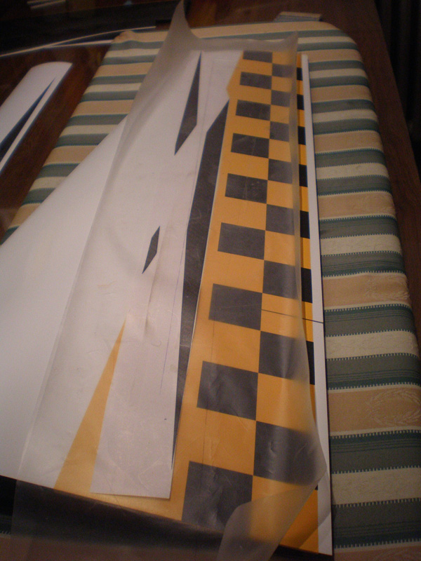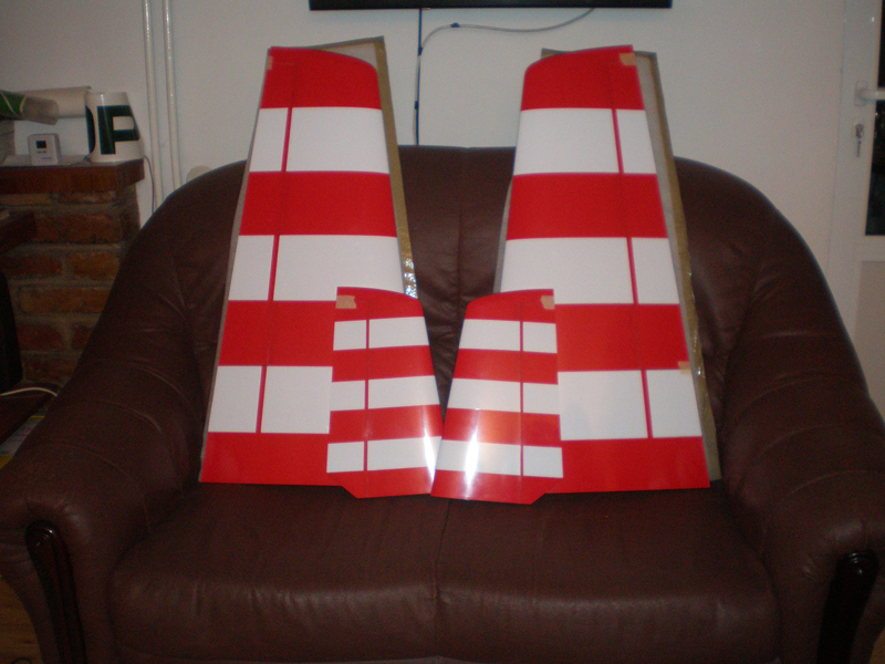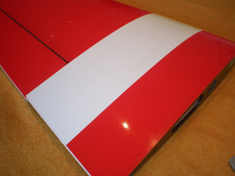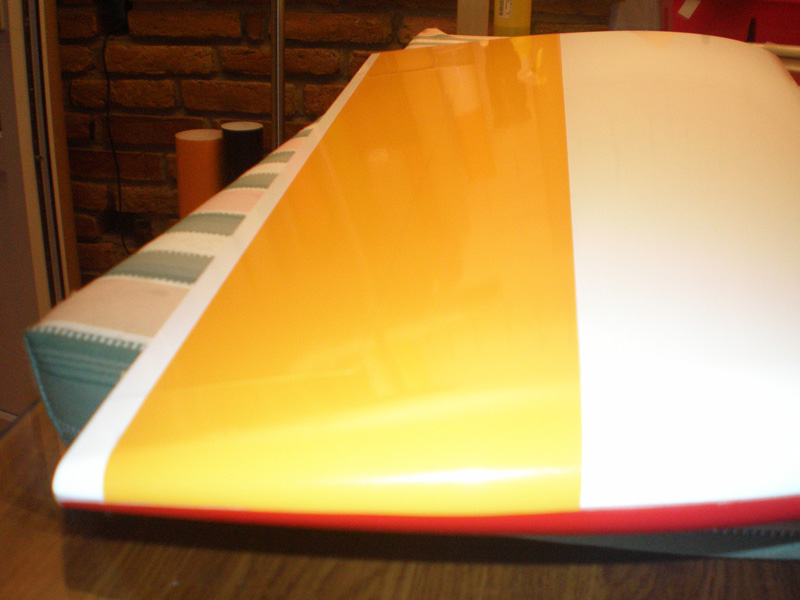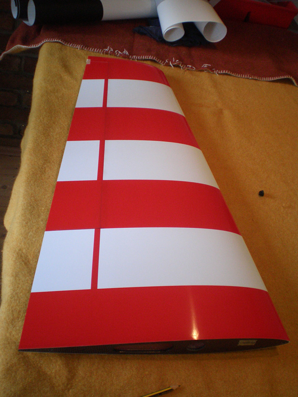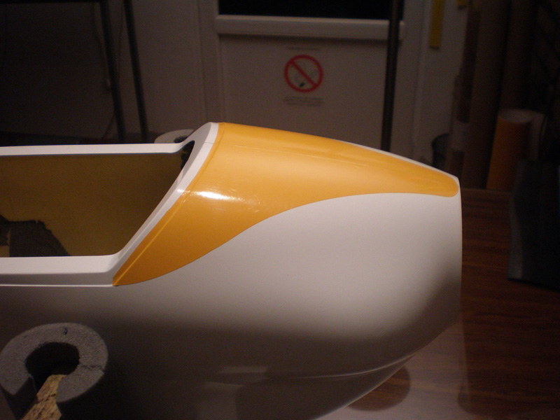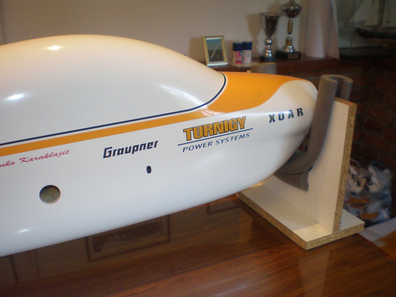 He bought it from Lorenz Modell from Germany. Model was white, and I have job to design and made finish on this model. Model are extremely easy, so painting it wasn't option, because first must add primer, than color, and everything must be paint with clear cote. So many layers will add to much weight, so we decided to made finish with self adhesive foils. Self adhesive foils are grate on flat surfaces but it can't be apply on rounded shapes. So, I must create design which will match with model... On Bravo upper surface and complete fuselage are white, and botom side of wings and elevators are red. My friend have wish to color scheme be totally different on upper and lower side. But before story about color scheme, look few pictures about model... Bravo is last generation in full composite F3A model... Attachment 2236439 Attachment 2236440 Attachment 2236441 Bottom wing side... Attachment 2236442 Attachment 2236443 Trailing edge... Attachment 2236444 Cabin is made from thin carbon... Attachment 2236445 Attachment 2236446 Attachment 2236447 Attachment 2236448 Attachment 2236449 Elevators was made with same technology as wings... Attachment 2236450 Attachment 2236451 Attachment 2236452 Attachment 2236453 Attachment 2236454 Attachment 2236455 Attachment 2236456 Few details about landing gear... Attachment 2236457 Attachment 2236458 Attachment 2236459 Attachment 2236460 Attachment 2236461 Attachment 2236462 Attachment 2236463 Attachment 2236464 And finally fuselage... Attachment 2236465 Attachment 2236466 Attachment 2236467 Attachment 2236468 Attachment 2236469 Attachment 2236470 Attachment 2236471 OK, now when we know how model look, lets start with work. I start working on lower wing side, and apply three white stripes... I use Oracal 641 self adhesive foils. Because wing surface are plastic, very thin and gentle, I use water for applying foil. System is simple, add water on surface, add water on sticky foil side, and aplly foil on surface. Bacause foil is wet, I could position white line very precise on wing... Attachment 2236472 Attachment 2236473 Attachment 2236474 Attachment 2236475 Than I used this little tool, and squeeze out water... Attachment 2236476 Attachment 2236477 Surface are without any bubble... When water dryed I add masking foil in edges which I want cut... Attachment 2236478 Attachment 2236479 Attachment 2236480 Attachment 2236481 On ailerons I must move white line from edge where aileron come inside in the wing. Gap is so small that foil will stuck on the edge... Attachment 2236482 Attachment 2236483 Attachment 2236484 Finally, I add one red stripe on first white line to made all lines same... Attachment 2236485 Attachment 2236486 Attachment 2236487 Than I made this process few more times, and get white lines on bottom sides... Same procedure was for elevators, but for applying white stripes I was not using water... Attachment 2236488 Attachment 2236489 For upper surface I made totally different color scheme. First I draw everything in computer in Corel... I made few proposals, to enable my friend to choose colors, but for me, and for him also, yellow and black was the best combination... Attachment 2236490 I bought yellow foil, and instead off black I take foil like carbon... Attachment 2236491 Attachment 2236492 On white wing side, first I add yellow areas, but before that I put together wings to draw a straight line. For that operation I use very "high tech" tool... Attachment 2236493 Attachment 2236494 Attachment 2236495 Attachment 2236496 Gluing was again with water... Attachment 2236497 Attachment 2236498 Attachment 2236499 Attachment 2236500 Technique was same like on bottom side... Attachment 2236501 Attachment 2236502 Than I apply cubes made from carbon foil... Attachment 2236503 I used transfer foil for this... Attachment 2236504 Attachment 2236505 Attachment 2236506 Attachment 2236507 Attachment 2236508 Than I made and apply lightning shadow, which was again from carbon foil... Attachment 2236509 Attachment 2236510 Attachment 2236511 After that letters and finally red lightning... Attachment 2236512 Attachment 2236513 Attachment 2236514 Attachment 2236515 Attachment 2236516 Attachment 2236517 Same procedures was on elevators... Attachment 2236518 Attachment 2236519 Attachment 2236520 Next was fuselage... Attachment 2236521 Attachment 2236522 First yellow areas... Attachment 2236523 Attachment 2236524 Attachment 2236525 Attachment 2236526 Attachment 2236527 I add black stripe for easier cutting... Attachment 2236528 Attachment 2236529 Attachment 2236532 Than copy - paste everything on other side... Attachment 2236533 Next was front end of the fuselage... I must made paper template... Attachment 2236534 Attachment 2236535 Than I scan it in computer and finally cut on my Roland cutter...... Attachment 2236536 Attachment 2236537 Next step was easy... Attachment 2236538 Attachment 2236539 Than I add yellow and black line on cabine. Yellow line connect front and rear yellow fuselage areas... Attachment 2236540 Attachment 2236541 But, when I add cabin on fuselage I saw that in fron was big white area... Paper templates again... Attachment 2236542 Attachment 2236543 Attachment 2236544 ...little cutting, little trimming and... Attachment 2236545 Attachment 2236546 Attachment 2236547 Attachment 2236548 On the foil lap I add "warbird" details - screws... Attachment 2236549 Next steps was to add letters, lightning with shadow, and all other details... I always made letters first on paper... Attachment 2236550 Attachment 2236551 Attachment 2236552 Attachment 2236553 Attachment 2236554 But, when I put wings on, I saw that right elevator is to much color full for my taste, so I change design... Attachment 2236555 Attachment 2236556 Attachment 2236557 Attachment 2236558 Last touch was adding authors logo... Attachment 2236559 And finally Bravo in full shine... Attachment 2236560 Attachment 2236561 Attachment 2236562 Attachment 2236563 Attachment 2236564 Attachment 2236565 At