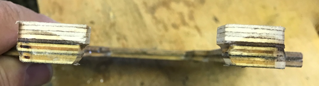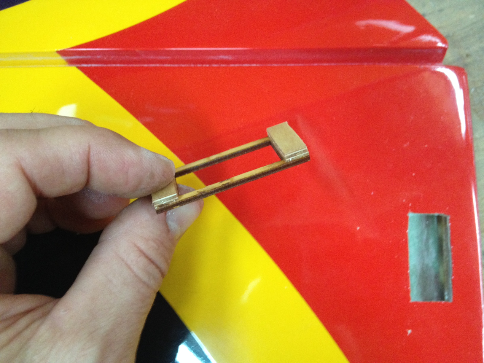 Locate the two motor mount beam plates. Place them one ontop of the other and align them, the cut out is slanted so turn one over untilthey align. Note which sides face each other and sand those two sides toprepare for gluing them together. http://www.rcuniverse.com/forum/atta...mentid=2200913 http://www.rcuniverse.com/forum/atta...mentid=2200915 Gluethe two beam plates together using epoxy mixed with micro balloons. Clamp themtogether and allow the epoxy to set. |