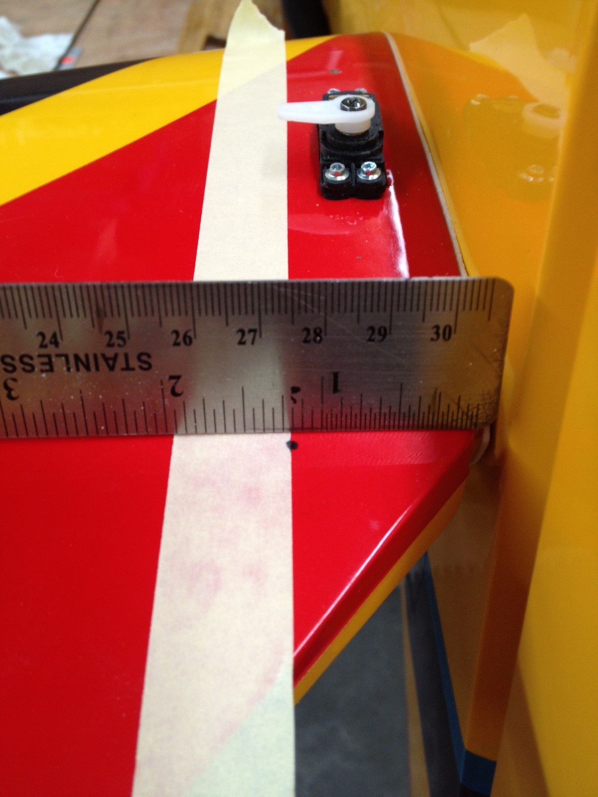 To install the stabs, I used the same technique as the wings. I did give more detailed photos for you to have a better understanding of how I did it. You will need to first place the plywood servo mounting tray in the location you want to mount your servo. Mark the inside of the tray for a cut line. Using an x-acto knife, cut out an access hole to mount the servo. Before you glue in the tray, please remember to double each side of the tray with plywood. This will give a stronger area for the servo screws to hold. Once the servo tray is mounted and the servo is in place, I used the straight edge the same way as I did with the wings. This time I used masking tap for you to have a better understanding of what I was talking about. Remember, once you have your location for your holes marked, drill one side at a time. Then insert a rod to verify the holes are in the correct location before you drill through with the final size bit .(see photo #6). Install servo and repeat on opposite side. The stab adjusters are held in place with two screws and have predrilled holes in the adjuster mount. As you can see in photo #1, I drilled an access hole for the stab adjuster. |