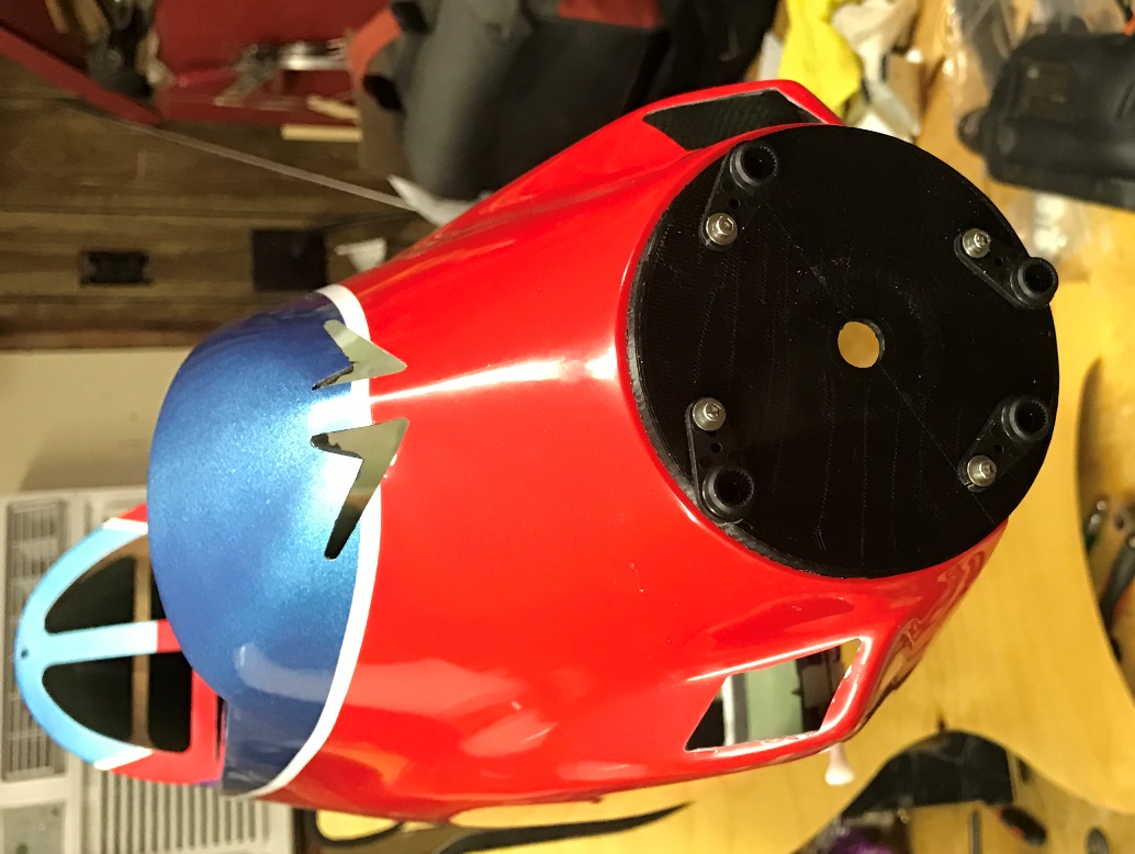 I made a nose plate jig to help hold my motor in place withthe proper alignment when fitting the beam plate into the nose. http://www.rcuniverse.com/forum/atta...mentid=2200923 It is the same OD as my spinner back plate, has a recess forthe motor’s thrust washer to give me the nose to spinner back plate gap Iwanted, and bolts to the motor like a spinner back plate. I aligned it to thenose of the Allure and drilled 4 small holes to use servo screws to attach itto the nose of the Allure. http://www.rcuniverse.com/forum/atta...mentid=2200924 |