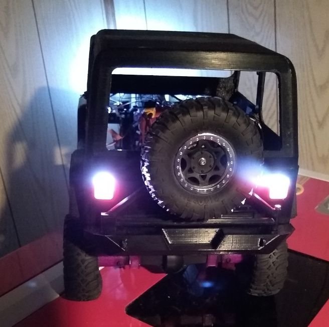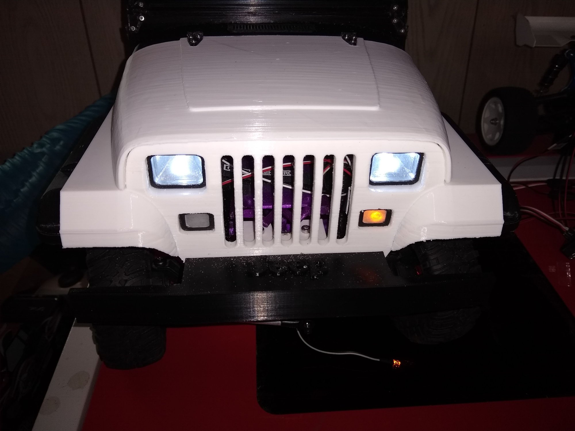 I went looking for something in a box, and found some axial SCX10 parts, and saw 2 fog lamps, and was like those would be perfect, so I made a fast bracket, and screwed them into the front bumper in the approximate spot they would go on a real YJ
