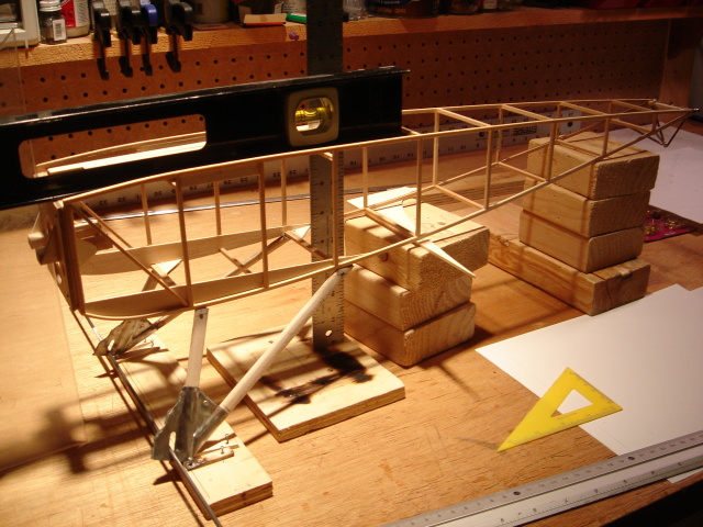 Problem I have now, is I have already a framed up wing in the appropriate chort and span, but it is not a scale wing, it is a 2412 airfoil with ailerons. The temptation is great to work up some quick cabane struts and bolt on this wing parasol fashion - it would be a very stable configuration and would allow me to complete the fuselage, fly it, and prove out the unproven parts i.e. the tail group and undercarriage. Then the question will be, once that the thing is flying, will I finish it out or move on to something else (something bigger!)