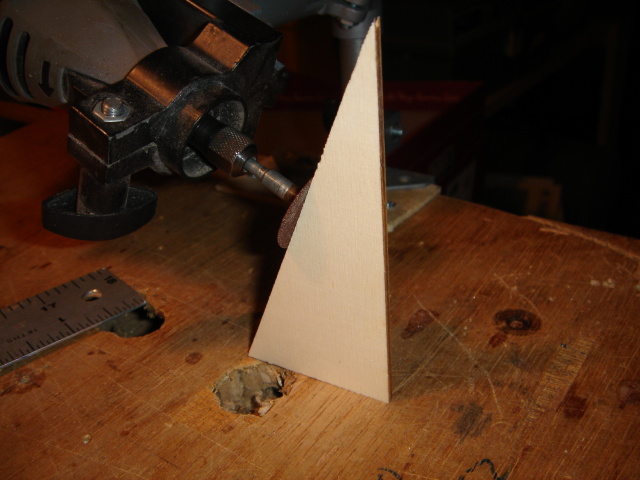 Next job is the front v-strut. Like the main strut, it is angled in two dimensions. To cut the angles at each end, I draw a "normalized" view of it looking from the side, onto a piece of plywood that becomes the holding fixture. The height of the side view is the hypoteneuse of the triangle that the strut makes from the fuse bottom, looking at the front view. The rotary tool is then angled appropriately using a plywood triangle-template, produced from the dimension of the front view. Actually, I did not have good dimensional info for these struts, so took measurements the best I could, of the space the pylon would occupy, and also used some small sticks that I cut to get an estimate of the final length of the struts.