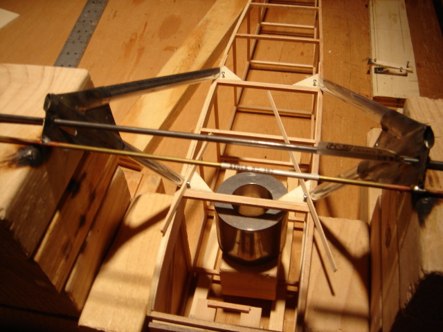 I turned the fuse upside down and used a bunch of blocks to align everything, basically trying to ensure the alignment of the axle perpendicular to the fuse. THen I took a spare piece of brass rod and soldered it across the front of the tin v- brackets.