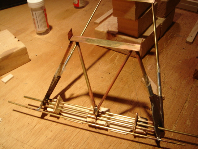 I propped up one strut with a bunch of blocks, soldered the bottom first, turned it over, did the top joint. Ditto for the second strut.