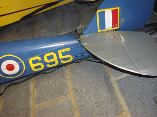 Here's a tail shot showing how I have the cables running. The upper elev cables run through an eyelet on the leading edge of the stab. The full-size has a short bar that runs through the eyelet with the cables attached to each end of it.